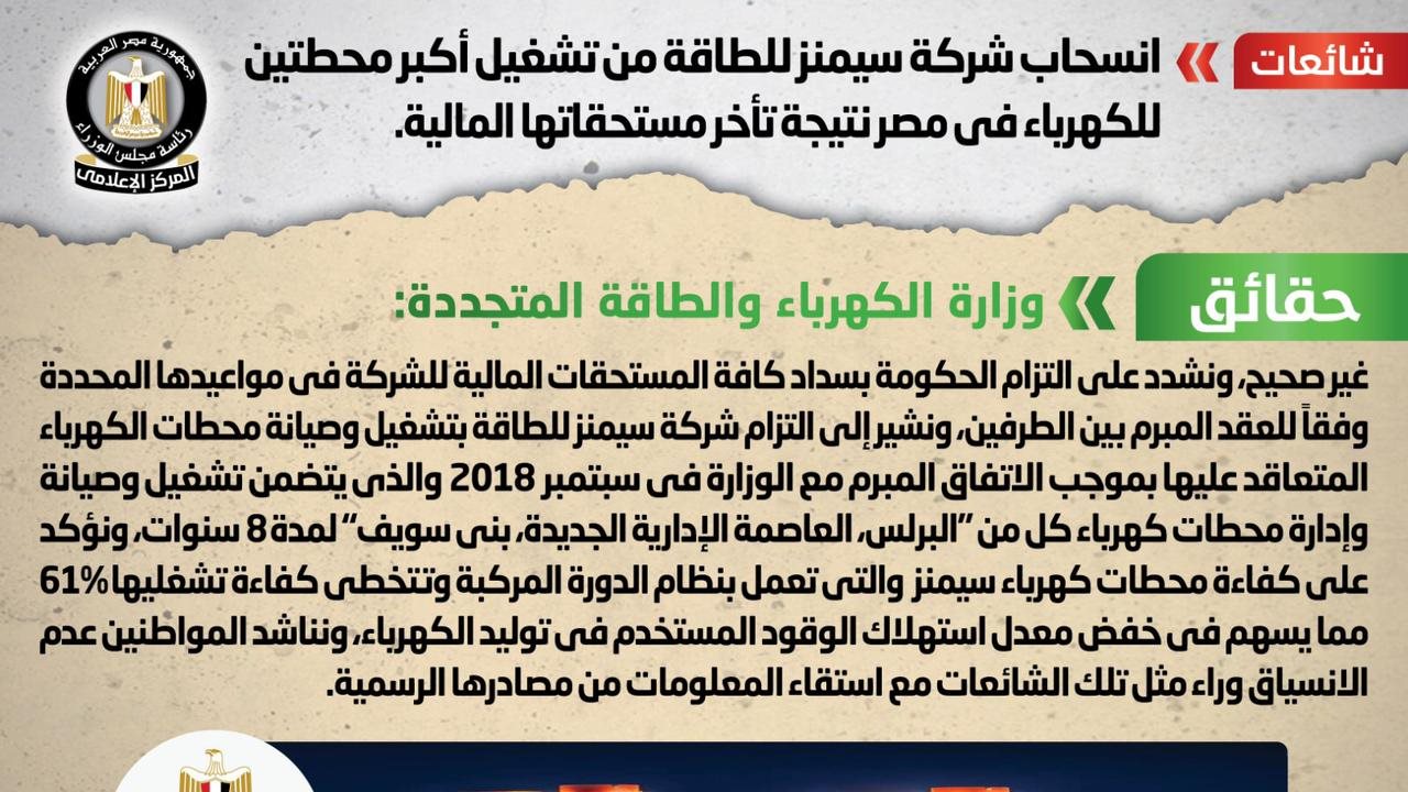 كشف المركز الإعلامى لمجلس الوزراء، إنه فى ضوء ما تردد من أنباء بشأن انسحاب شركة سيمنز للطاقة من تشغيل أكبر محطتين للكهرباء في مصر نتيجة تأخر مستحقاتها المالية، تواصل المجلس مع وزارة الكهرباء والطاقة المتجددة، والتي نفت تلك الأنباء.