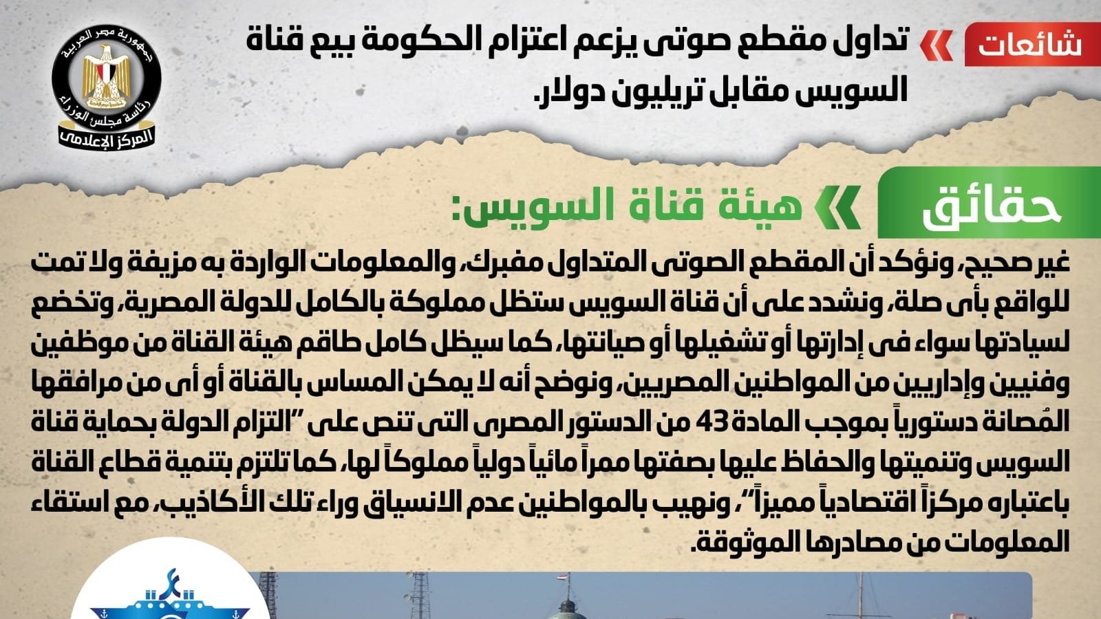 وقام المركز الإعلامي لمجلس الوزراء، بالتواصل مع هيئة قناة السويس، والتي نفت تلك الأنباء، مُؤكدةً أنه لا صحة لاعتزام الحكومة بيع قناة السويس مقابل تريليون دولار، وأن المقطع الصوتي المتداول مفبرك، والمعلومات الواردة به مزيفة ولا تمت للواقع بأي صلة، مُشددةً على أن قناة السويس ستظل مملوكة بالكامل للدولة المصرية، وتخضع لسيادتها سواء في إدارتها أو تشغيلها أو صيانتها، كما سيظل كامل طاقم هيئة القناة من موظفين وفنيين وإداريين من المواطنين المصريين.