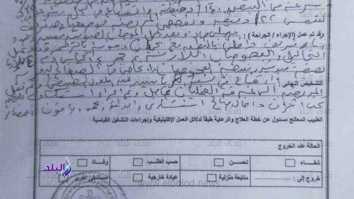 وعقب اتمام العملية القيصرية تم ايداع الحالة فى القسم الداخلى للمتابعة وبعد ذلك تلاحظ وجود نزيف مهبلى للحالة وتم اتخاذ الاجراءات المعتادة والاتصال مجددا بالطبيب للعودة لمناظرة حالته بسرعة.