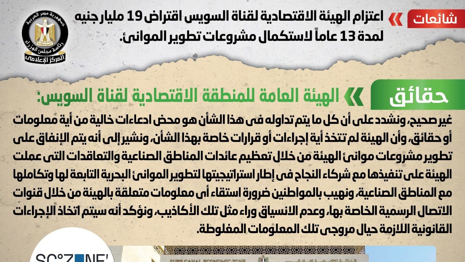 وقد قام المركز الإعلامي لمجلس الوزراء بالتواصل مع الهيئة العامة للمنطقة الاقتصادية لقناة السويس، والتي نفت تلك الأنباء، مُؤكدةً أنه لا صحة لاقتراض الهيئة 19 مليار جنيه لمدة 13 عاماً لاستكمال مشروعات تطوير الموانئ، مشددةً على أن كل ما يتم تداوله في هذا الشأن هو محض ادعاءات خالية من أية معلومات أو حقائق، وأن الهيئة لم تتخذ أية إجراءات أو قرارات خاصة بهذا الشأن .