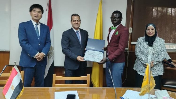 سلم الدكتور سعد موسى المشرف على العلاقات الزراعية الخارجية، نيابة عن علاء فاروق وزير الزراعة واستصلاح الأراضي، وشينو ماساو نائب رئيس مكتب هيئة التعاون الدولي اليابانية "جايكا" بمصر، شهادات البرامج التدريبية للمبعوثين الأفارقة، والذين أتموا البرنامج التدريبي بالمركز المصري الدولي للزراعة، حول البحوث والإرشاد في الأرز.