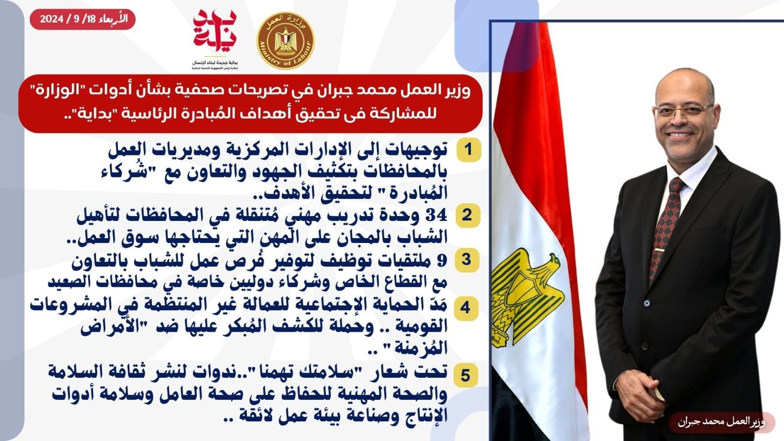 وجه محمد جبران ،وزير العمل ،اليوم الأربعاء ،الإدارات المركزية ،ومديريات العمل بالمحافظات ،بتكثيف الجهود والتعاون مع كافة الوزارات ،والجهات المعنية لسرعة تحقيق أهداف المبادرة الرئاسية "بداية جديدة لبناء الإنسان"التي أطلقها رئيس مجلس الوزراء د. مصطفى مدبولي ،أمس الثلاثاء، لتحسين جودة الحياة لجميع المواطنين في مختلف أنحاء الجمهورية ،وتقديم الخدمات الحكومية في مجالات: التعليم، والصحة، والثقافة، والرياضة، والتوظيف، بطريقة تكاملية بين مختلف الجهات المشاركة، وهو ما يأتي اتساقاً مع ما التزمت به الحكومة في برنامج عملها للفترة" 2024 – 2027"..وقال وزير العمل أن "الوزارة" تُساهم ،في هذه المُبادرة من خلال 34 وحدة تدريب مهني مُتنقلة ،منتشرة في المحافظات ،لتدريب وتأهيل الشباب ،وبالمجان ،على المهن التي يحتاجها سوق العمل ،وكذلك تنظيم 9 ملتقيات توظيف بالتعاون مع شركاء العمل والتنمية،وبرنامج الأغذية العالمي ،لتوفير فُرص عمل حقيقية للشباب ،خاصة في محافظات الصعيد..