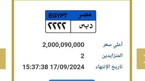 وظهرت اللوحة المميزة ن د أ، صاحبة الرقم 555، والتي يتزايد عليها شخص واحد حتى تلك اللحظة، كما سينتهي موعد المزايدة في الثاني من أكتوبر ولكن في الساعة 09:49:12، ووصل سعر المزايدة على تلك اللوحة إلى 125 ألف جنيه.