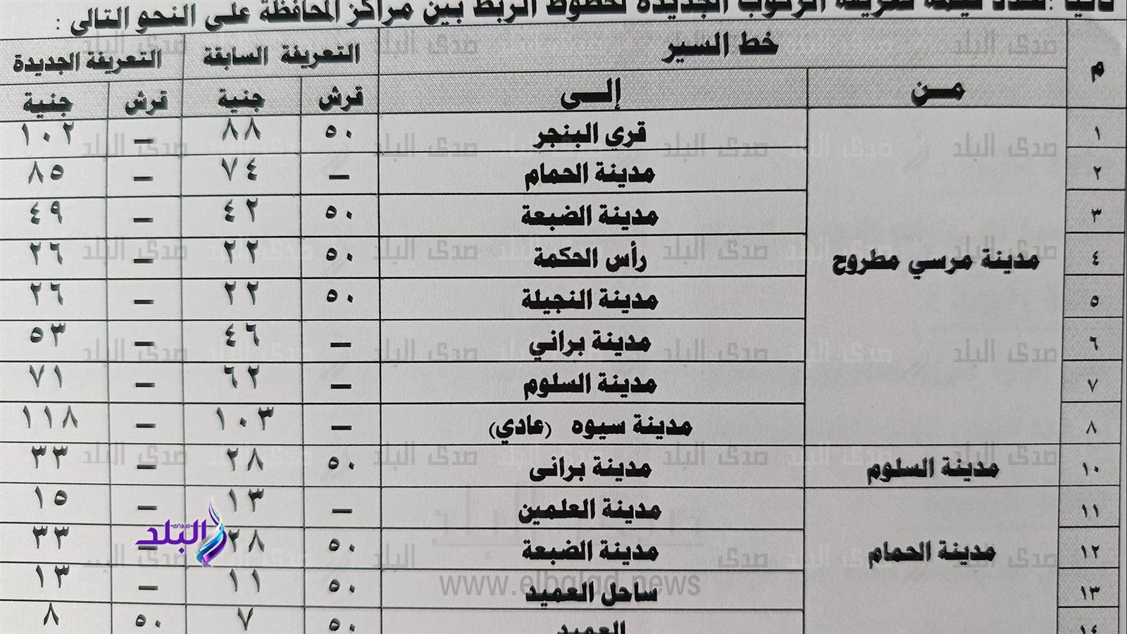 يذكر أنه قد تم الإعلان عن أسعار تعريفة الركوب الجديدة لسيارات الأجرة بالخطوط الداخلية والخارجية بمحافظة مطروح حيث نص القرار على زيادة تعريفة الركوب لوسائل المواصلات لجميع الخطوط الداخلية بالمحافظة والخارجية بين المحافظات بما يتناسب مع الزيادة المقررة.بما يتراوح بين ١٥ % لسيارات الأجرة و ١١،٥جنيهات أجرة التاكسي مع بدء فتح عداد الأجرة و٤ جنيهات لكل كيلو