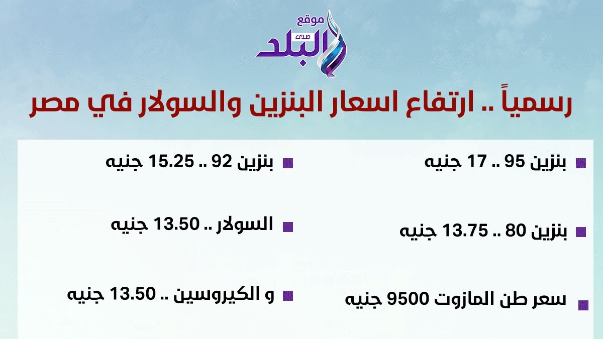 بالنسبة للسولار، فقد بلغ سعر اللتر 13.5 جنيه، بدلاً من 11.5 جنيه. وفيما يخص غاز السيارات، فقد تحدد سعر المتر المكعب بـ 7 جنيهات، مقابل 6.5 جنيه سابقًا.