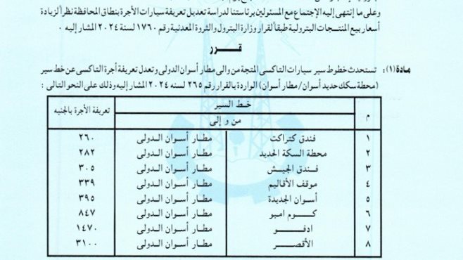 قرر اللواء دكتور إسماعيل كمال محافظ أسوان تعديل تعريفة الأجرة للمواصلات الداخلية والخارجية وسيارات نقل الركاب السيرفيس داخل المحافظة وبين المراكز وزياديتها بنسبة تتراوح ما بين 12 % إلى 15 % حيث يأتى ذلك عقب صدور قرار لجنة التسعير التلقائى للمنتجات البترولية بزيادة أسعار الوقود .