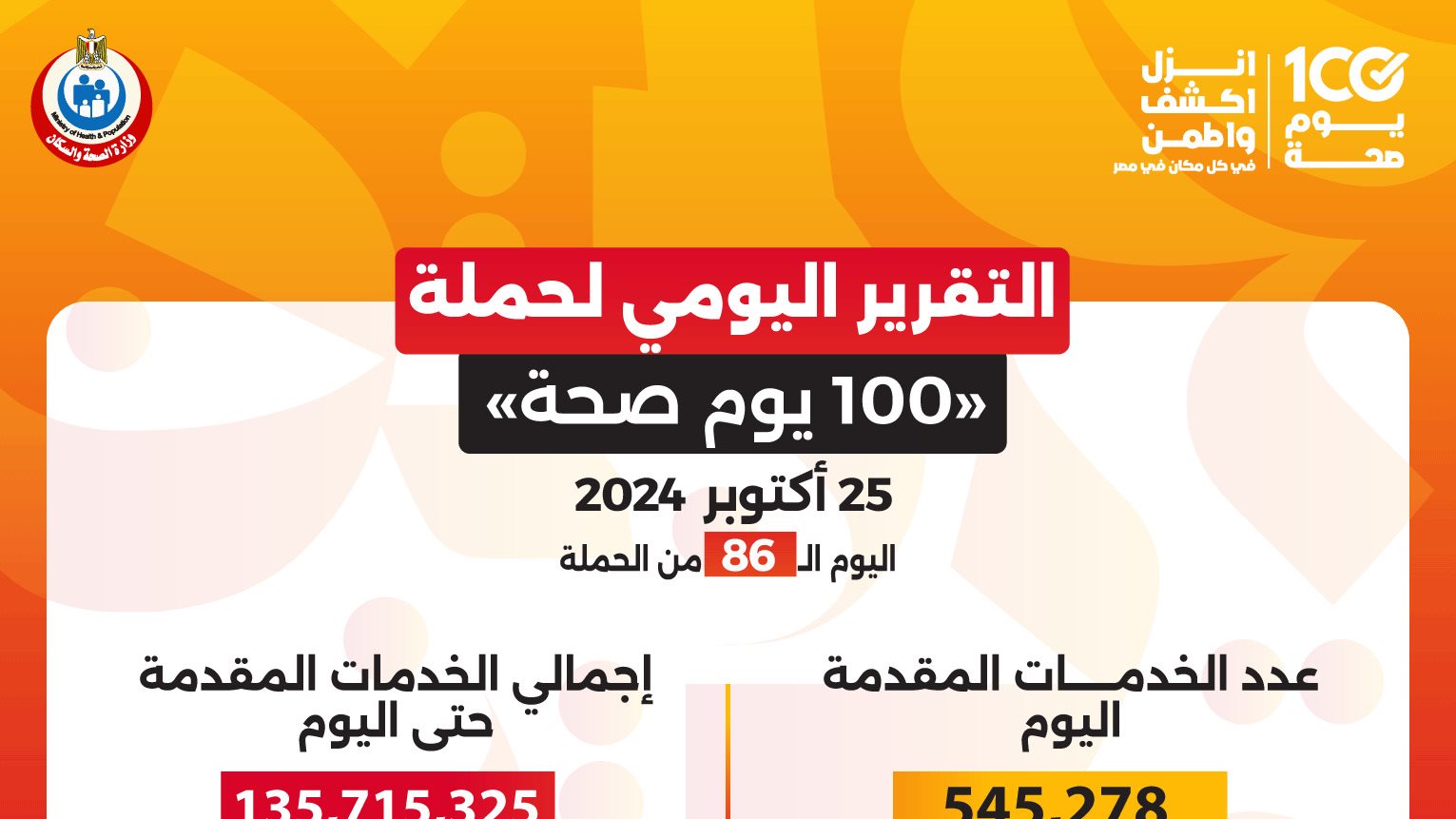 وأضاف «عبدالغفار» أن حملة «100 يوم صحة» قدمت خدمات التوعية والتثقيف الصحي لـ76 ألفا و480 مواطنا، من خلال فرق التواصل المجتمعي المنتشرة بالمناطق العامة والنوادي والمولات بالمحافظات، لرفع الوعي وتوجيه المواطنين إلى تلقي الخدمات التي تقدمها الحملة، إلى جانب عقد الندوات التثقيفية والأنشطة التوعوية.