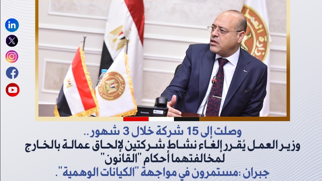 وكان الوزير جبران قد قرر خلال الثلاثة أشهر الماضية، إلغاء وإيقاف نشاط 13 من الشركات المماثلة، وذلك لمخالفتهم أحكام قانون العمل رقم 12 لسنة 2003، والقرارات الوزارية المُنفذة له .. وبحسب بيان صادر عن الوزارة وجه الوزير الإدارات المُختصة بتكثيف المُتابعة لأوضاع ونشاط شركات إلحاق العمالة في جميع المحافظات، للتأكد من مُراعاتها لأحكام القانون، والتعامل مع المواطنين بشكل قانوني ولائق ..وجدد "الوزير" التحذير والتنبيه إلى المواطنين بعدم التعامل مع الشركات أو الكيانات الوهمية ،وأنه لا وساطة مع الوزارة في تقديم الخدمات التي تُقدم مجانًا ..يُشار هنا إلى أن قانون العمل رقم 12 لسنة 2003 ،حدد شروط إيقاف الترخيص أو إلغاؤه ، حيث أنه إذا فقدت الشركة شرطاً من شروط الترخيص ، أو تقاضت مبالغ من العامل نظير تشغيله بالمخالفة لأحكام القانون،أوتقديم بيانات غير صحيحة للحصول على الترخيص،تستحق إيقاف الترخيص،أوإلغائه .