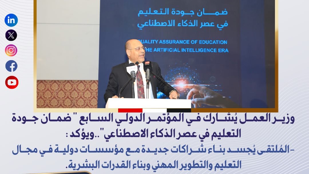 شارك وزير العمل محمد جبران، اليوم الأحد في المؤتمر الدولي السابع " ضمان جودة التعليم في عصر الذكاء الاصطناعي"، الذي نظمته الهيئة القومية لضمان جودة التعليم والاعتماد ،والمنعقد في القاهرة، بحضور الدكتور محمد الضويني وكيل الأزهر الشريف، مُمثلاً عن فضيلة الإمام الأكبر شيخ الأزهر أحمد الطيب، والدكتور محمد أيمن عاشور وزير التعليم العالي والبحث العلمي ،والدكتور أسامة الأزهري وزير الأوقاف، ومحمد عبد اللطيف وزير التربية والتعليم والتعليم الفني، والدكتور علاء عشماوي رئيس مجلس إدارة الهيئة القومية لضمان جودة التعليم والاعتماد، والدكتورة نادية بدراوي رئيس الشبكة العربية لضمان الجودة في التعليم العالي، والدكتور مايكل ك. ج. ميليغان الرئيس التنفيذي لهيئة الاعتماد (ABET) من الولايات المتحدة الأمريكية، والدكتور دوغلاس بلاك ستوك، رئيس الرابطة الأوروبية لضمان الجودة في التعليم العالي (ENQA)، والدكتور محمد عمارة رئيس الهيئة المصرية لضمان الجودة والاعتماد للتعليم الفني.