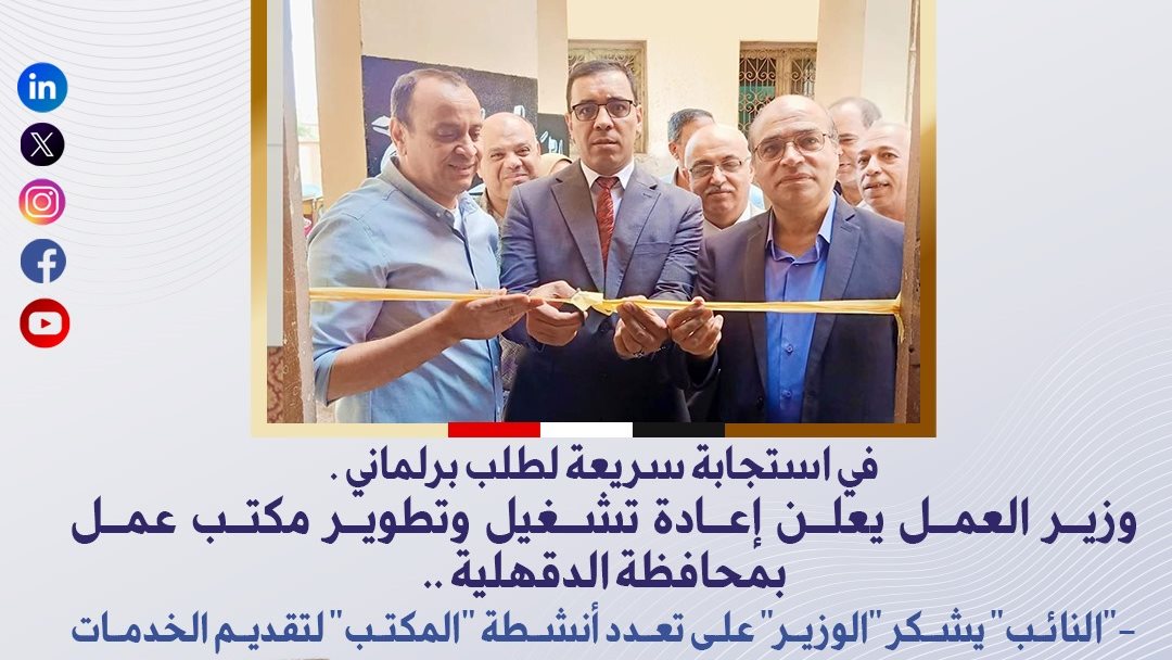 وكان عضو مجلس النواب، د. مكرم رضوان، قد تقدم بطلب برلماني إلى وزير العمل بشأن إعادة تشغيل مكتب العمل،لمساعدة المواطنين الحصول على الخدمات بشكل لائق وكريم ...
