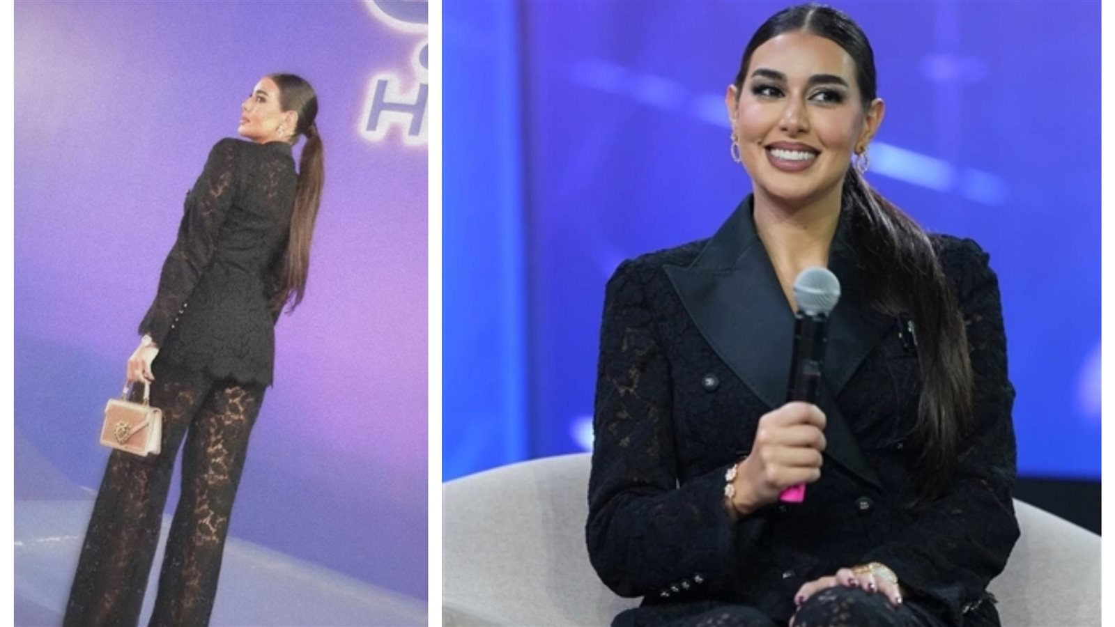 وقامتأسيل عمران بترك خصلات شعرها السوداء إلى منسدلة على ظهرها وأكتافها بتسريحة انسيابية ناعمة، وهو ما تناسب مع تفاصيل إطلالتها.
