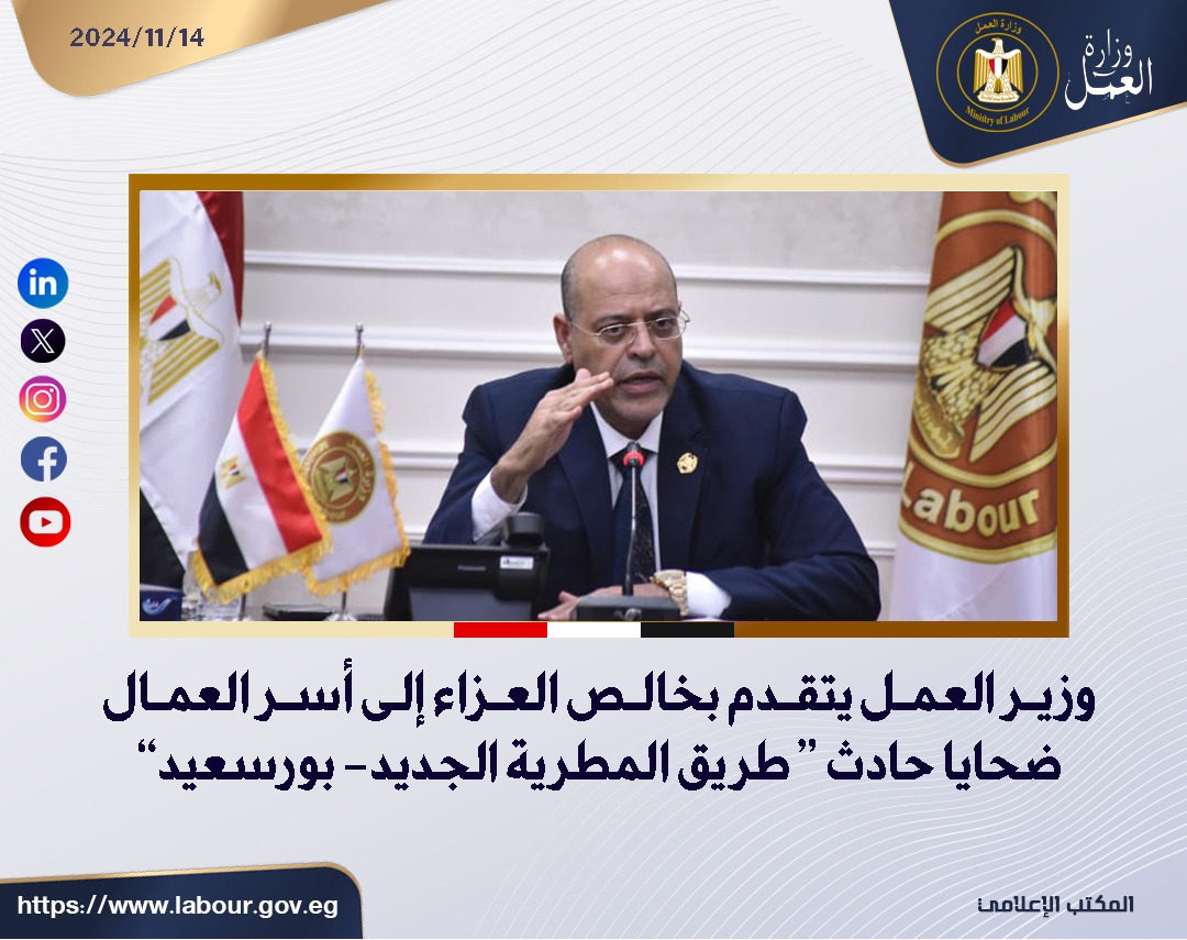 ووجه الوزير جبران مديرية عمل محافظة بور سعيد بمتابعة تفاصيل الحادث، والمستحقات المالية لهؤلاء العمال ،بحسب القانون ، وإرسال تقرير عاجل بشأنه، وكذلك مديرية عمل محافظة الدقهلية بالتوجه إلى أسر الضحايا لتقديم واجب العزاء ،والمواساة .. من الجدير بالذكر أن طريق "المطرية الجديد - بورسعيد" قد شهد منذ ساعات، حادث تصادم سيارة نقل مع أتوبيس لنقل العاملين بالمنطقة الصناعية بجنوب بورسعيد، أثناء عودتهم مما أدى إلى إصابة 22، ووفاة 12 شخص.