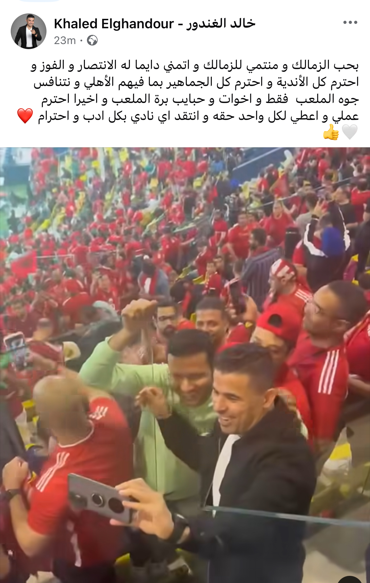 شارك الإعلامي ونجم الزمالك السابق خالد الغندور فيديو أثناء تواجده في المدرجات، عبر حسابه الشخصي بموقع فيسبوك وعلق عليه قائلاً: "بحب الزمالك ومنتمي للزمالك واتمني دايما له الانتصار و الفوز و احترم كل الأندية واحترم كل الجماهير بما فيهم الأهلي و نتنافس جوه الملعب فقط و اخوات و حبايب برة الملعب و اخيرا احترم عملي واعطي لكل واحد حقه و انتقد اي نادي بكل ادب و احترام".