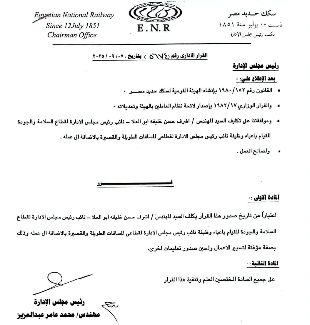قررت الهيئة القومية لسكك حديد مصر، تكليف المهندس أشرف حسن خليفة، نائب رئيس مجلس الإدارة لقطاع السلامة والجودة، بالقيام بأعباء وظيفة نائب رئيس مجلس الإدارة لقطاعي المسافات الطويلة والقصيرة، وذلك بصفة مؤقتة لتسيير الأعمال بجانب عمله الحالي، ولحين صدور تعليمات أخرى.