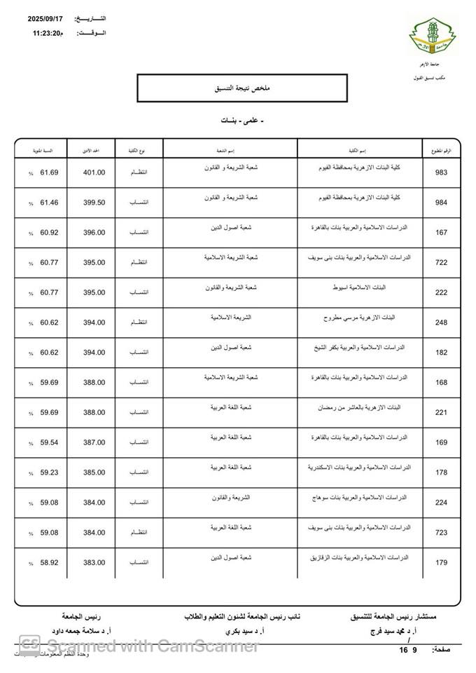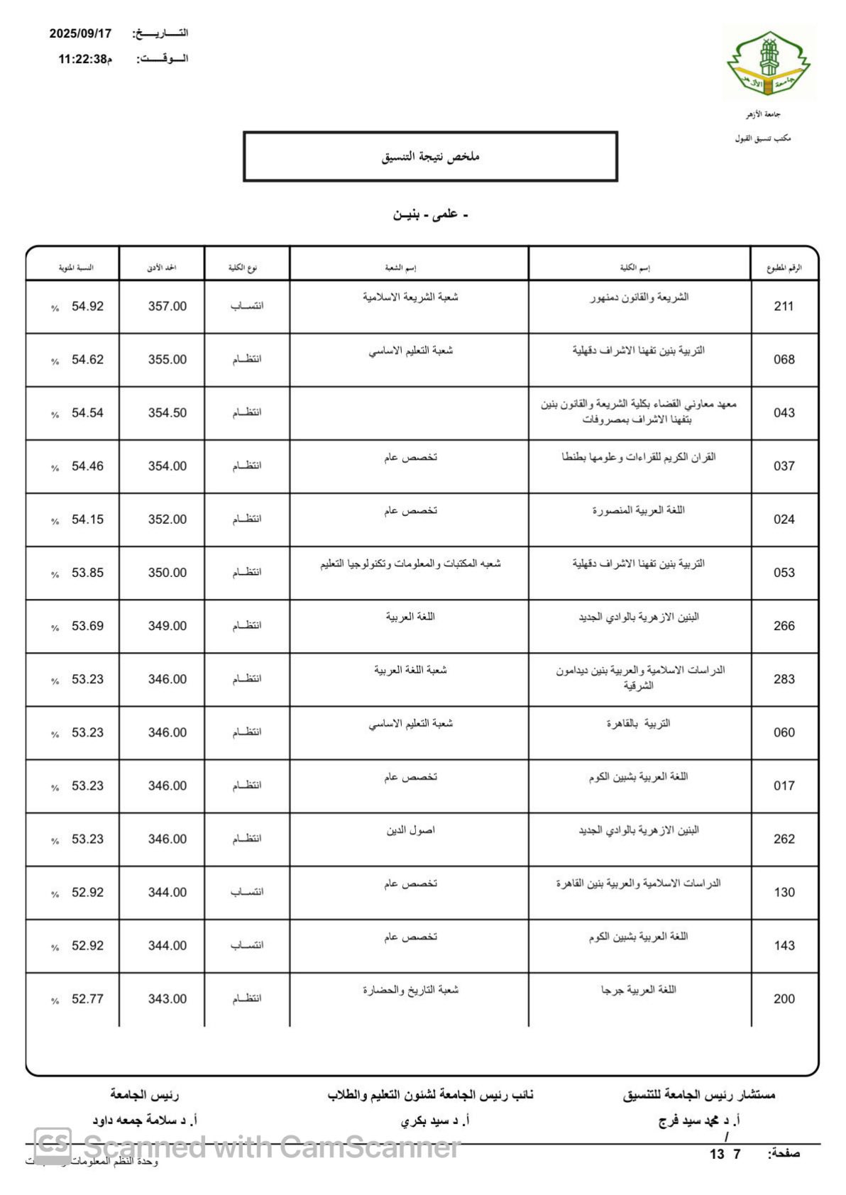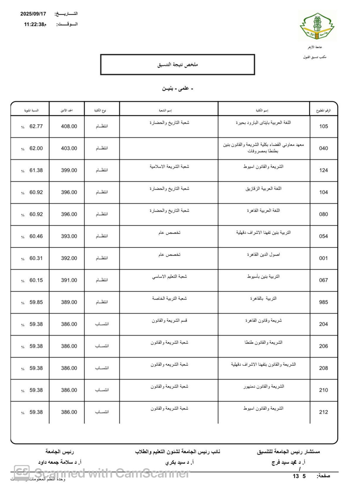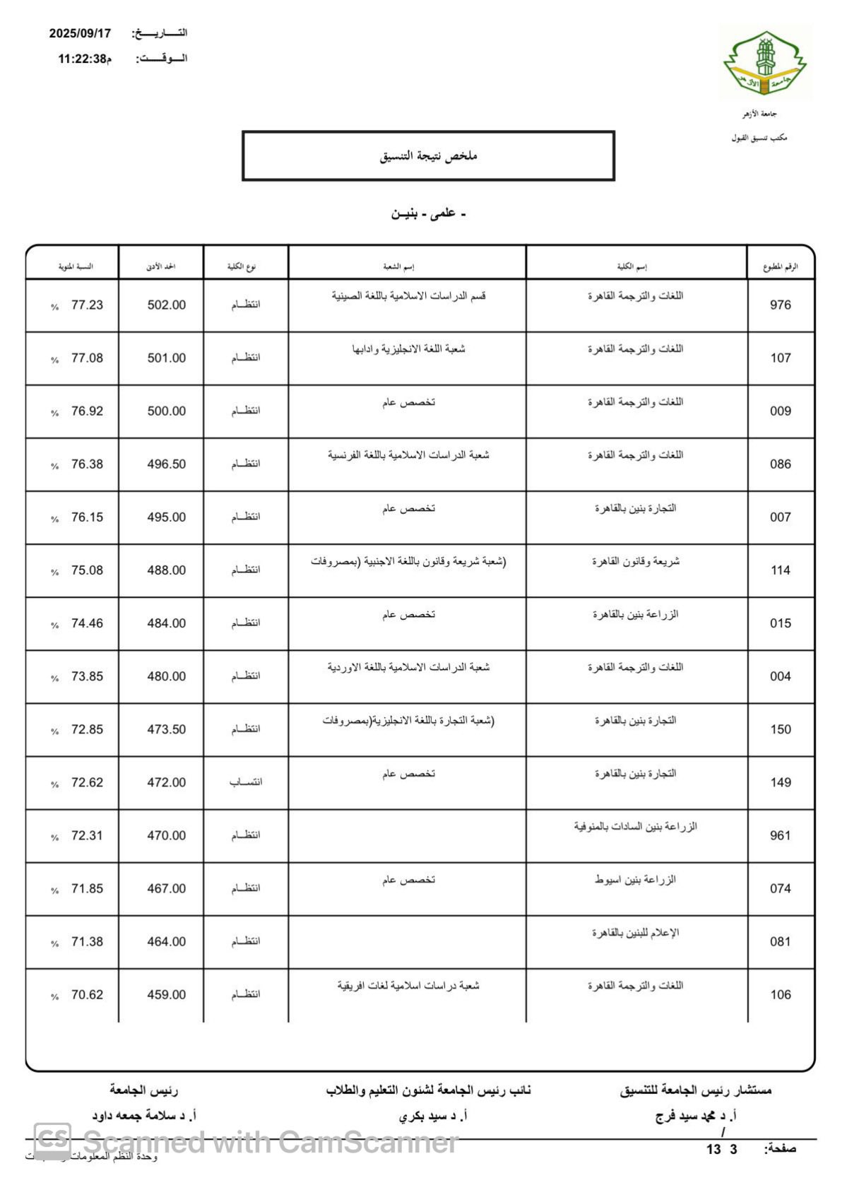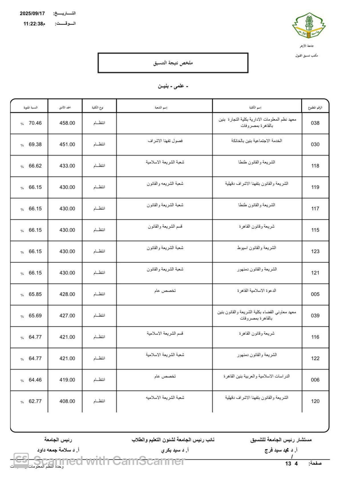 كلية الدراسات الإسلامية والعربية بنات بالقاهرة شعبة الشريعة والقانون باللغة الإنجليزية ( 488) درجة بنسبة 75.08 %