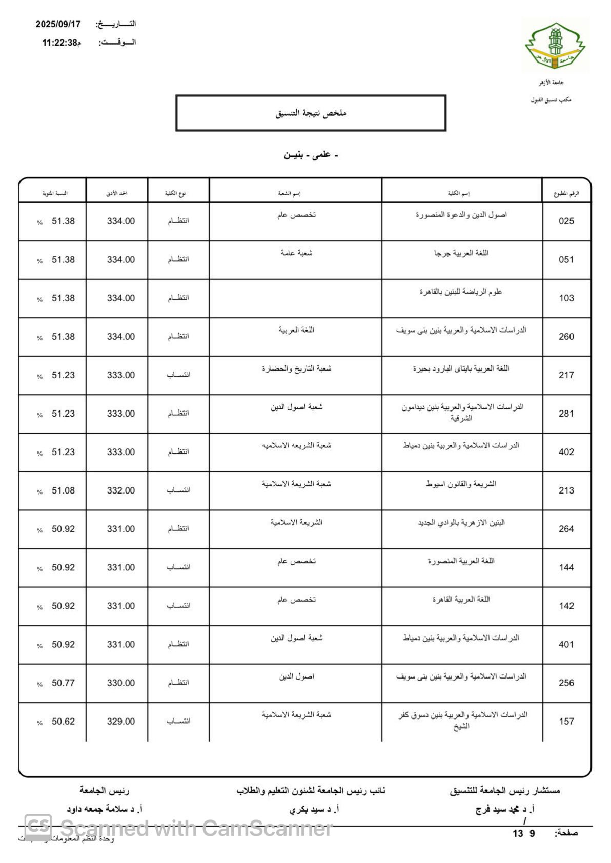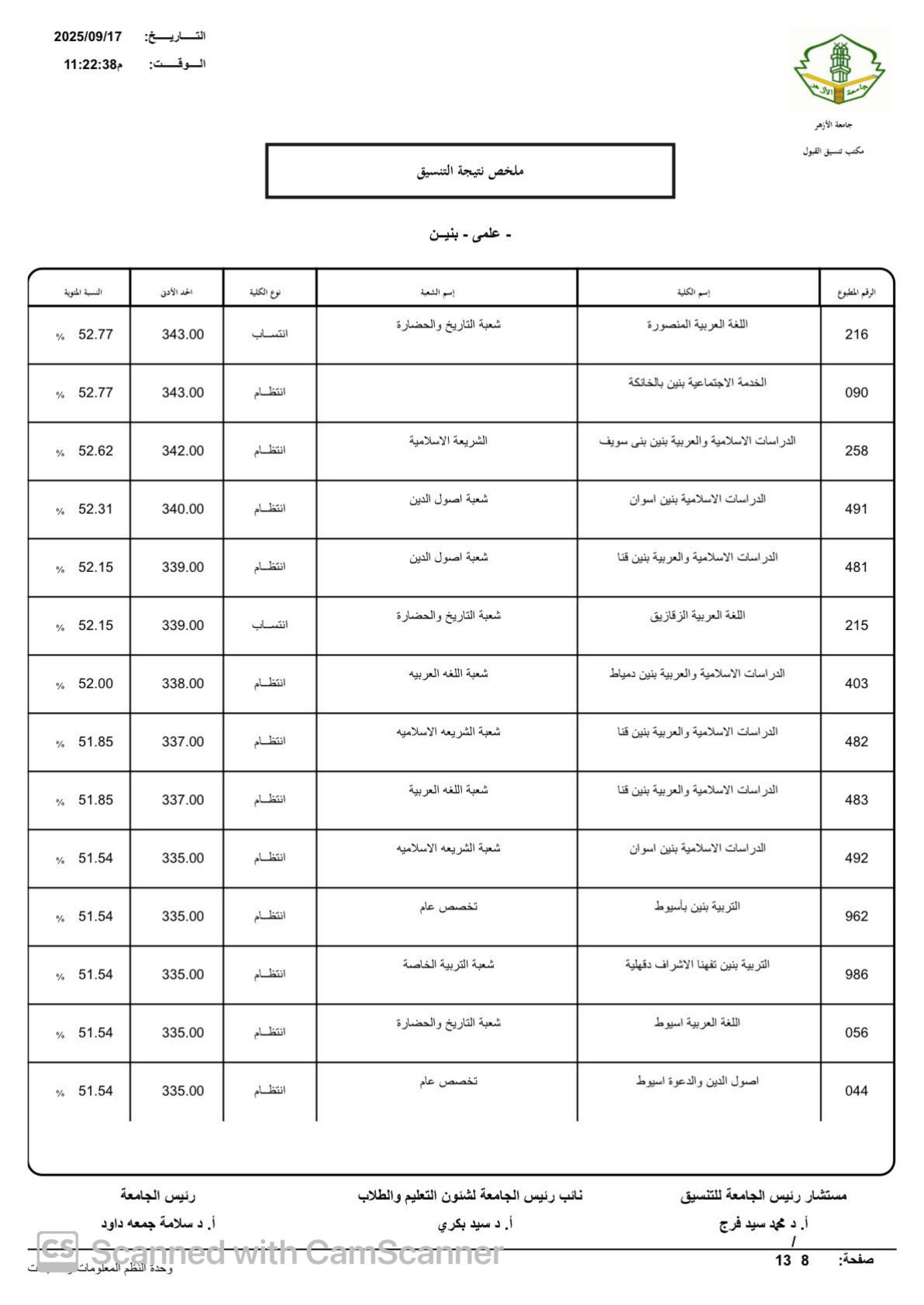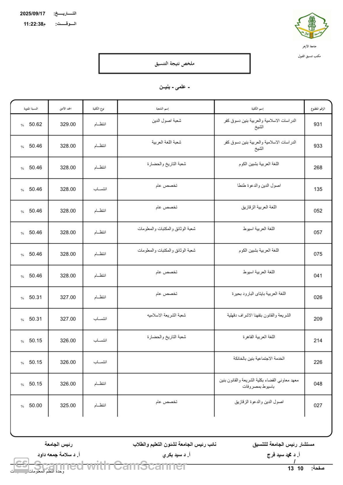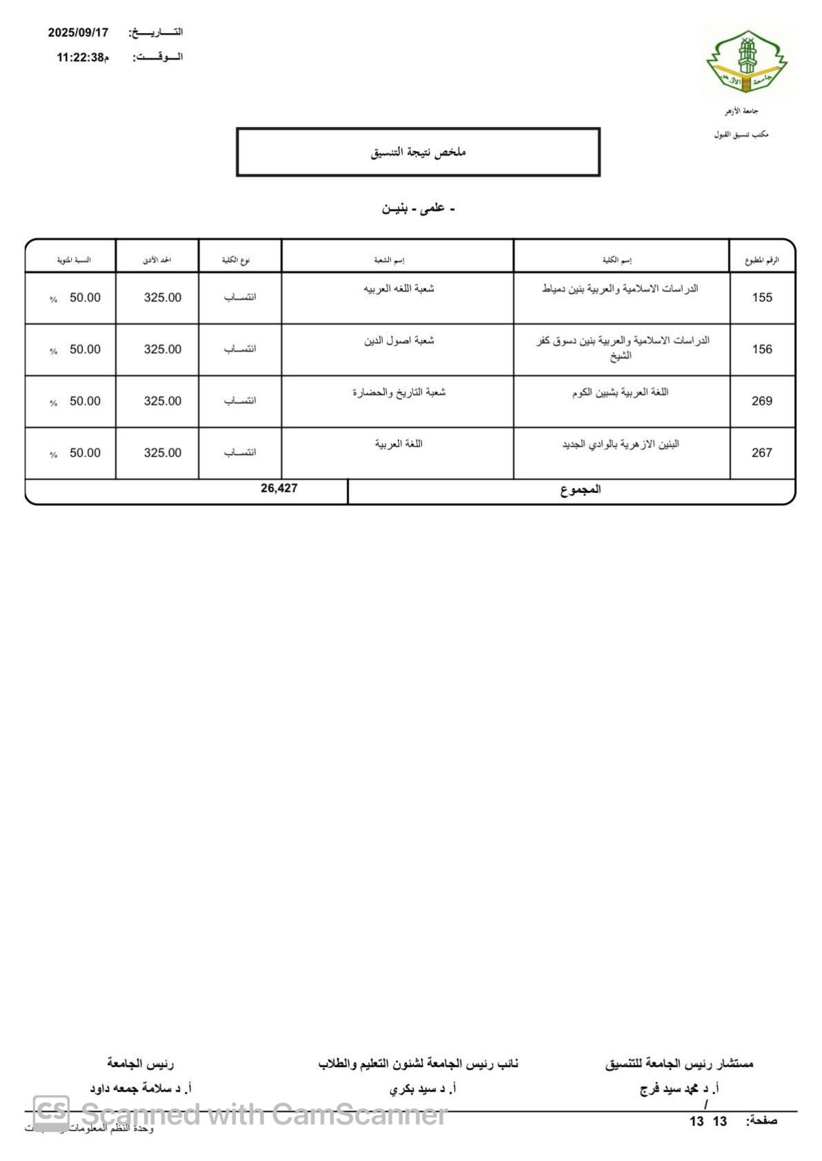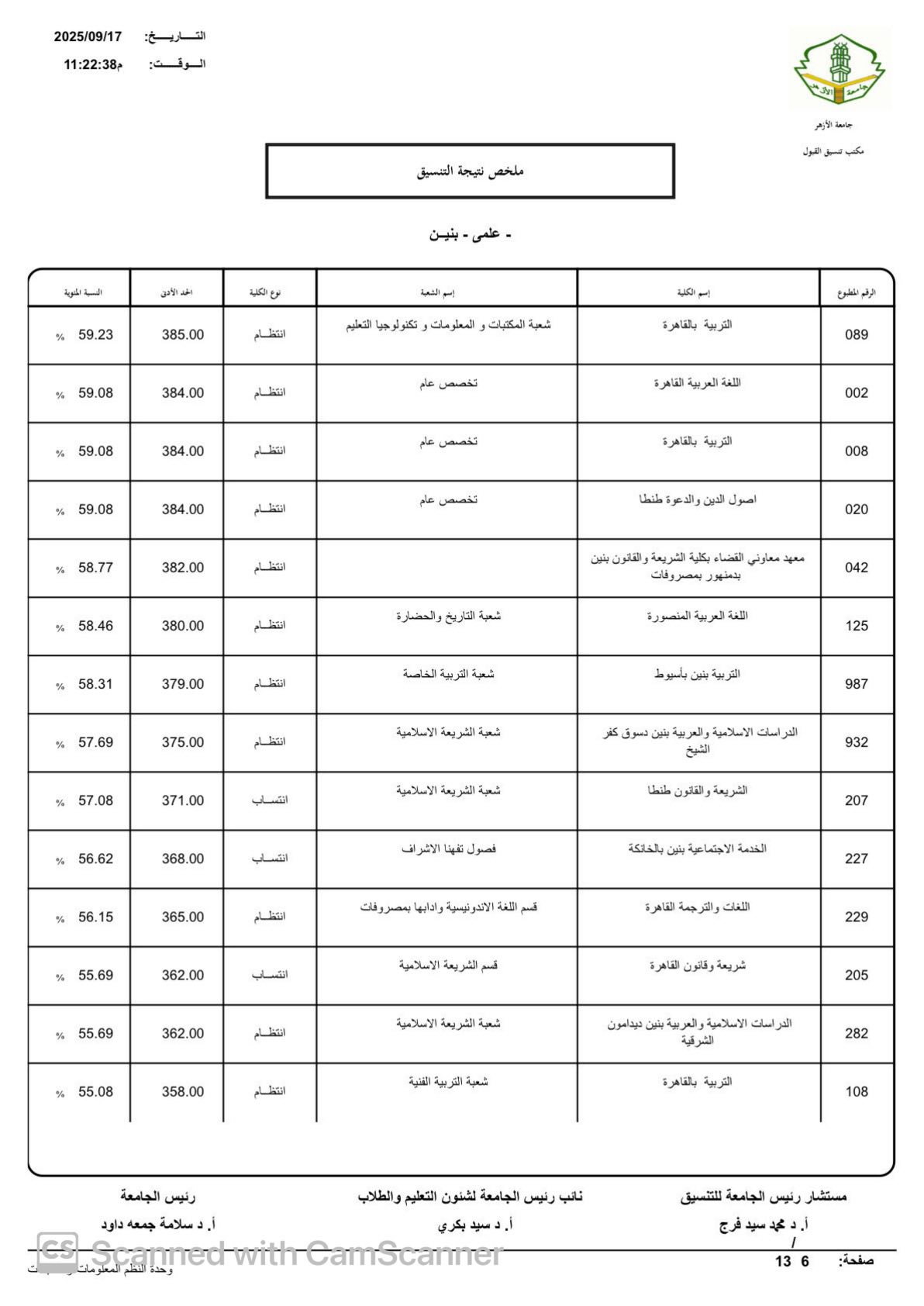 كلية الدراسات الإسلامية والعربية بنات بالقاهرة شعبة الشريعة والقانون باللغة الإنجليزية ( 488) درجة بنسبة 75.08 %