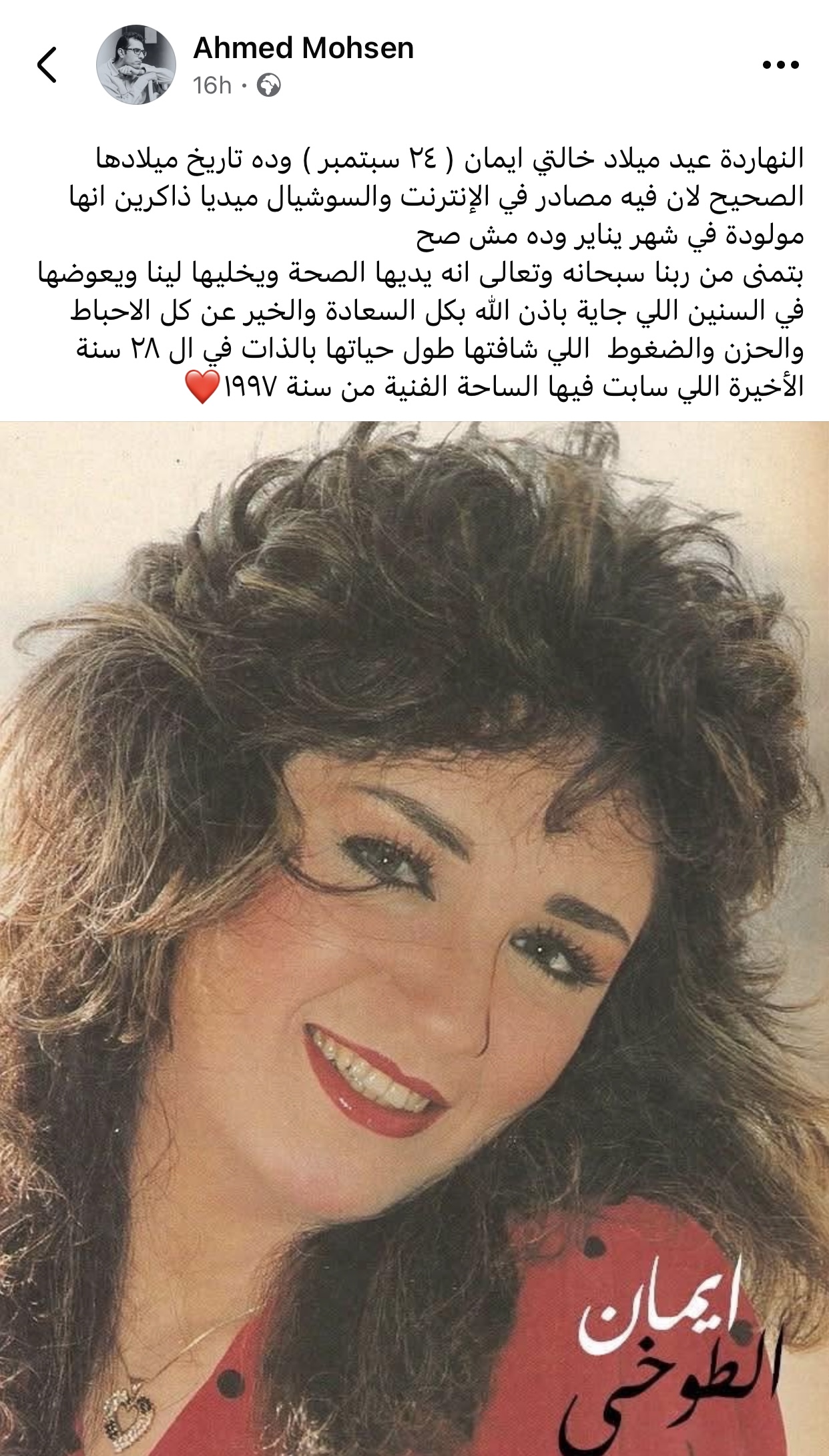 وكتب أحمد محسن عبر حسابه الشخصي بموقع فيسبوك: “النهاردة عيد ميلاد خالتي ايمان ( ٢٤ سبتمبر ) وده تاريخ ميلادها الصحيح لان فيه مصادر في الإنترنت والسوشيال ميديا ذاكرين انها مولودة في شهر يناير وده مش صح”.