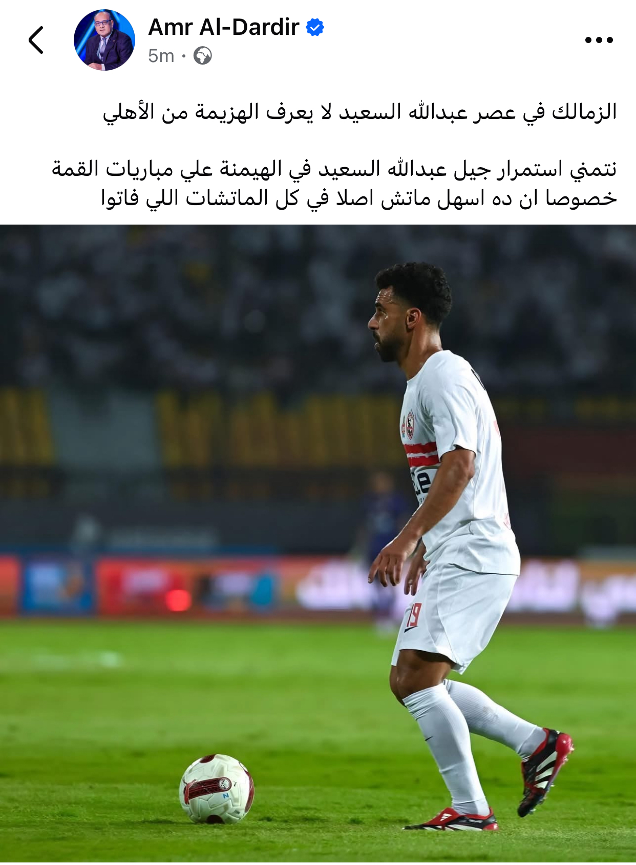 وكتب الدرديري عبر حسابه الشخصي بموقع فيسبوك: “الزمالك في عصر عبدالله السعيد لا يعرف الهزيمة من الأهلي، نتمني استمرار جيل عبدالله السعيد في الهيمنة علي مباريات القمة خصوصا ان ده اسهل ماتش اصلا في كل الماتشات اللي فاتوا”.