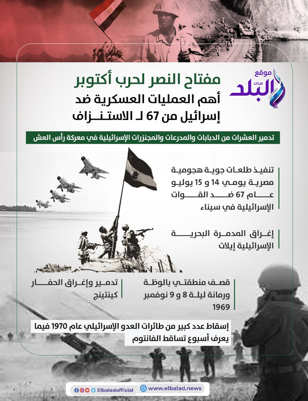وبمناسبة مرور 52 عاما على نصر أكتوبر، ننشر أهم العمليات العسكرية للجيش المصري ضد إسرائيل منذ عام 1967 حتى حرب الاستنزاف والتي ساهمت في انتصار السادس من أكتوبر.