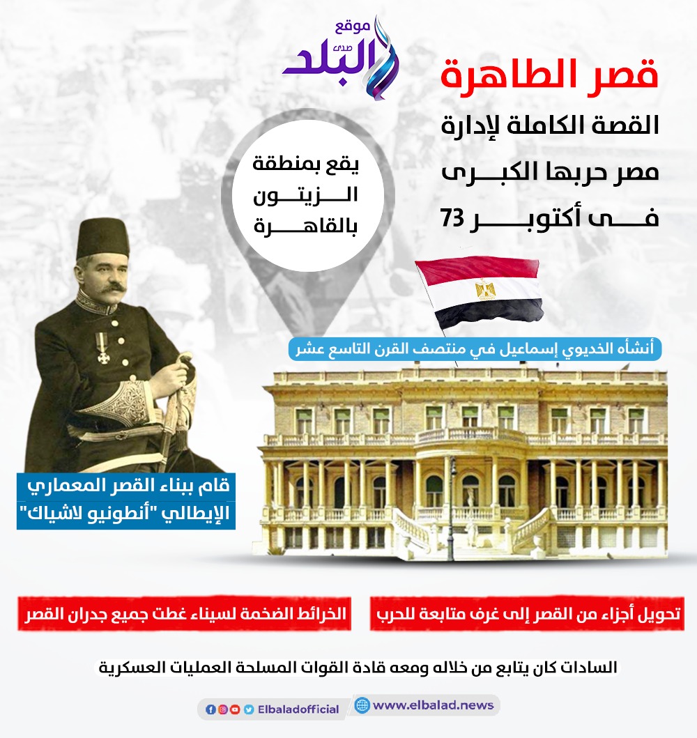وعلى الرغم من مرور 52 عاما على نصر السادس من أكتوبر، إلا أن الكثيرين لا يعرفون من أين أدُيرت أعظم وأنبل معركة عسكرية في التاريخ البشري، وهي معركة نصر أكتوبر 73، إذ كان "قصر الطاهرة" شاهدا على إدارة أعظم معركة عسكرية في التاريخ الحديث، حيث كان القصر مسرحاً لعمليات حرب أكتوبر 73.