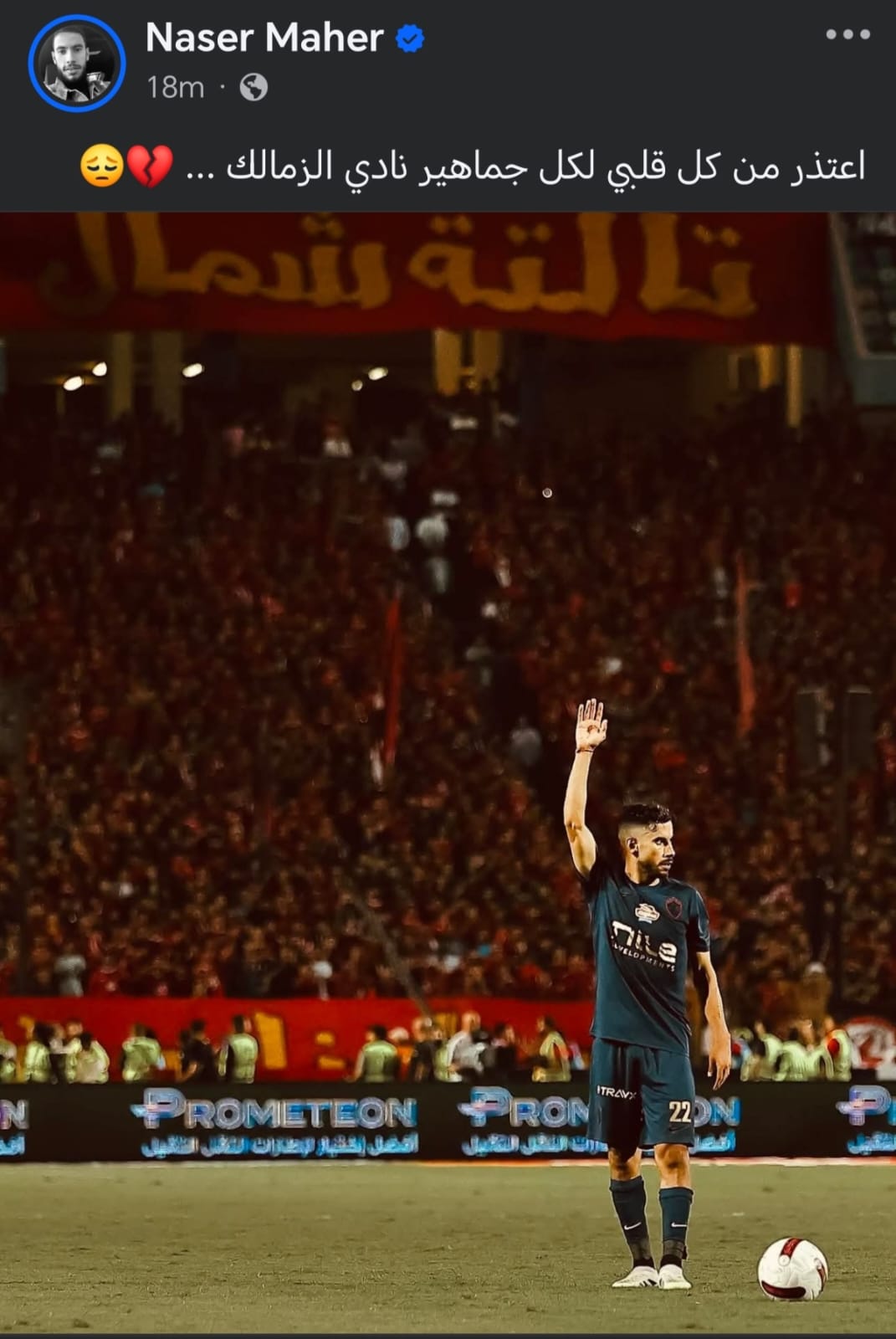 وكتب ناصر ماهر عبر حسابه الشخصي على موقع التواصل الاجتماعي فيس بوك: "أعتذر من كل قلبي لكل جماهير نادي الزمالك."
