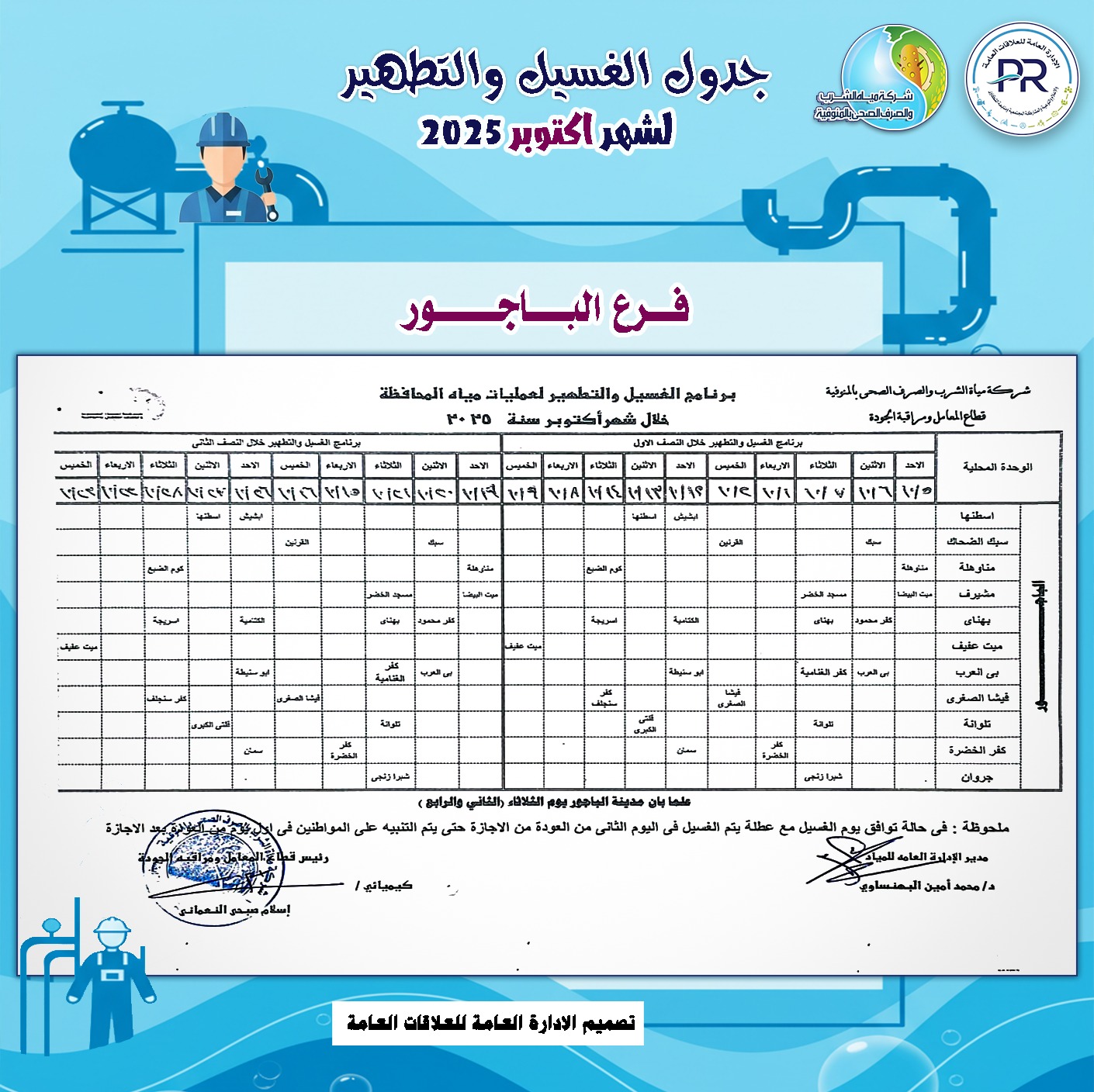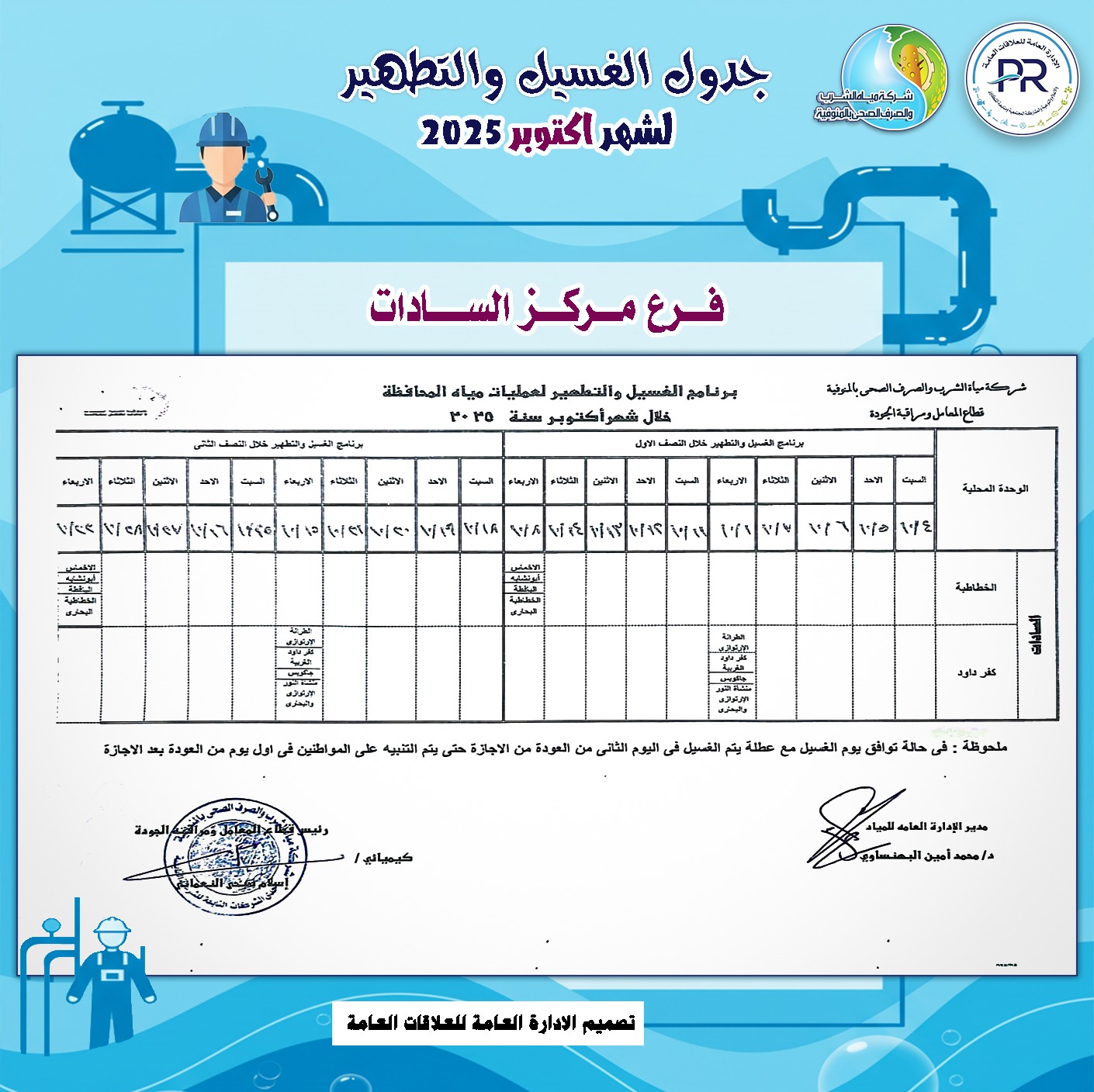 أعلن المهندس رشدي السيد عمر ، رئيس شركة مياه الشرب والصرف الصحى بالمنوفية، خطة غسيل شبكات المياه بكافة مناطق المحافظة خلال شهر أكتوبر 2025م وفقًا للمناطق المحددة بجدول الغسيل الدورى للشبكات .