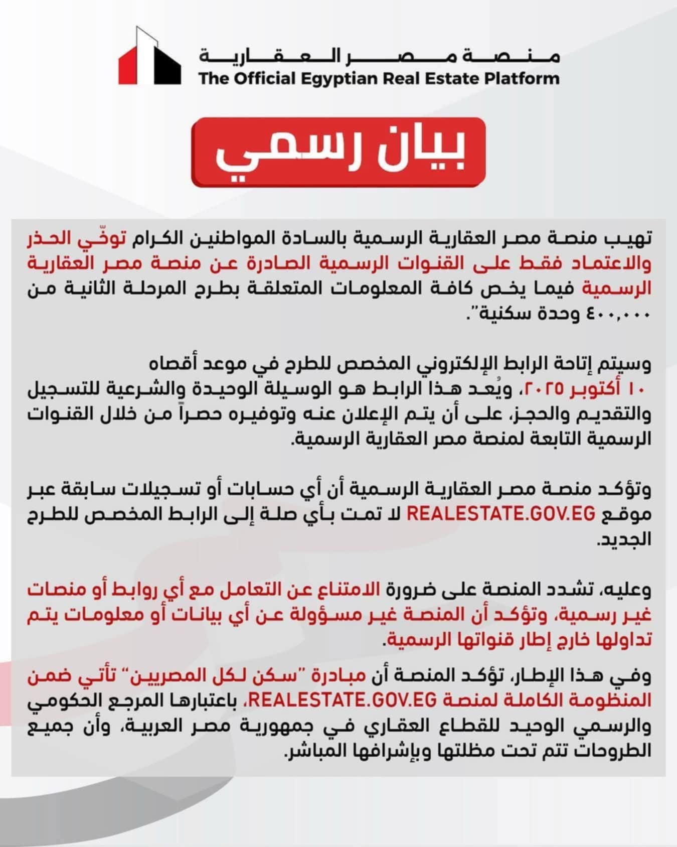 أهابت منصة مصر العقارية الرسمية بالمواطنين ضرورة توخي الحذر وعدم الانسياق وراء أي روابط أو منصات غير رسمية، مؤكدة أن المعلومات المتعلقة بطرح المرحلة الثانية من مشروع الإسكان، الذي يتضمن 400 ألف وحدة سكنية، سيتم إعلانها عبر قنواتها الرسمية.
