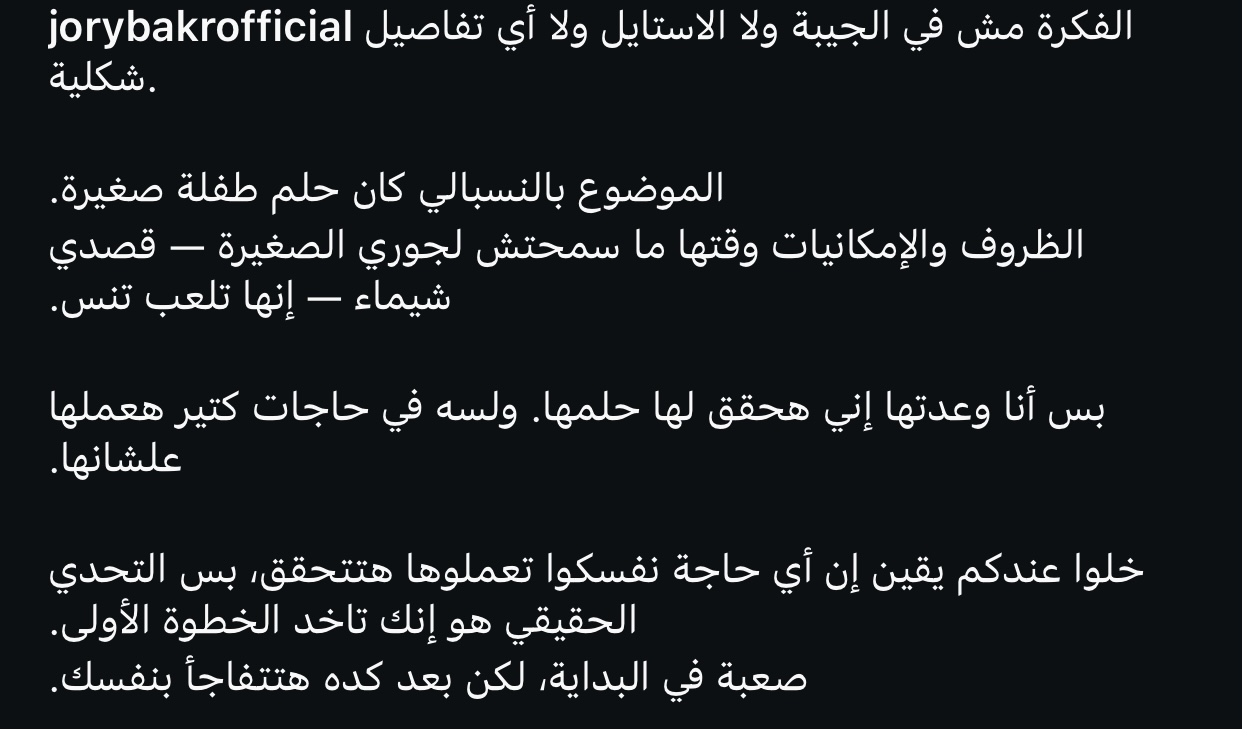 ونشرت جوري بكر عدة صور أثناء لعبها التنس على حسابها الشخصي بموقع إنستجرام وعلقت على الصور قائلة: “الفكرة مش في الجيبة ولا الاستايل ولا أي تفاصيل شكلية، الموضوع بالنسبالي كان حلم طفلة صغيرة”.