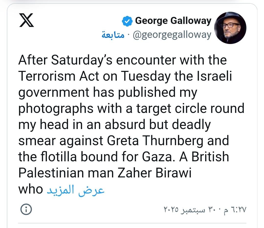 وقال جالاوي، في بيان عبر حسابه على منصة "إكس"، إنه فوجئ بظهور صورته محاطة بدائرة حمراء كإشارة إلى أنه مستهدف، ضمن منشورات إسرائيلية تتهمه بالارتباط بأسطول "الصمود" المتجه إلى غزة.