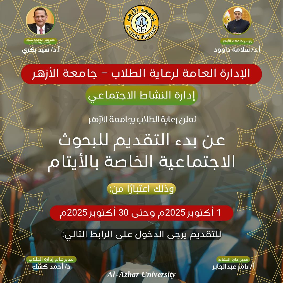 وقالت: تعلن رعاية الطلاب بجامعة الأزهر عن بدء التقديم للبحوث الاجتماعية الخاصة بالأيتام.
