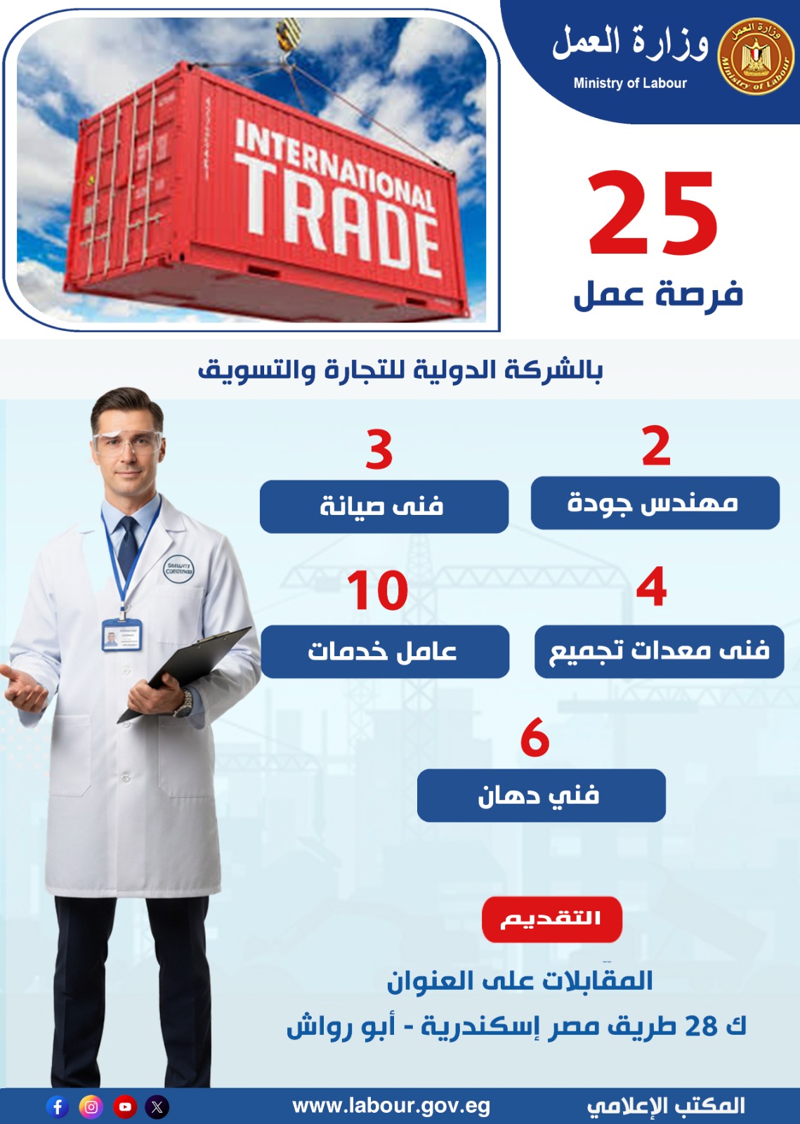 أعلنت وزارة العمل اليوم الخميس، عن توفير 25 فرصة عمل جديدة، بالتعاون مع الشركة الدولية للتجارة والتسويق، وبالتنسيق بين الإدارة العامة للتشغيل بالوزارة، ومديرية عمل الجيزة، في إطار جهود الوزارة لفتح مجالات جديدة للتشغيل وتوفير فرص عمل لائقة للشباب.
