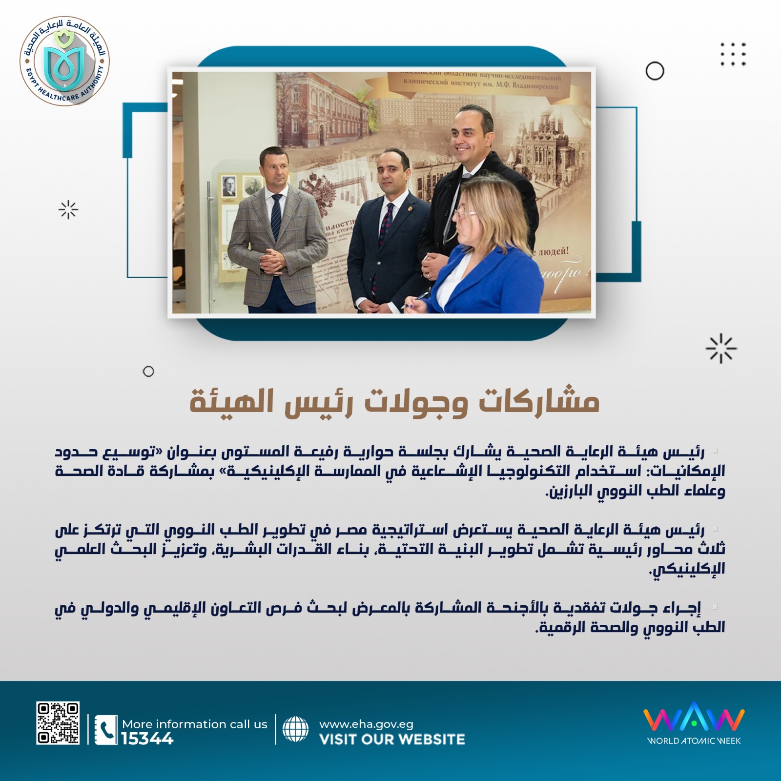 وفي إطار مشاركاته الفاعلة ضمن فعاليات الأسبوع الذري العالمي، شارك رئيس هيئة الرعاية الصحية في جلسة حوارية رفيعة المستوى بعنوان «توسيع حدود الإمكانيات: استخدام التكنولوجيا الإشعاعية في الممارسة الإكلينيكية»، حيث استعرض خلالها استراتيجية مصر في تطوير الطب النووي التي ترتكز على ثلاثة محاور رئيسية هي: تطوير البنية التحتية، بناء القدرات البشرية، وتعزيز البحث العلمي الإكلينيكي.