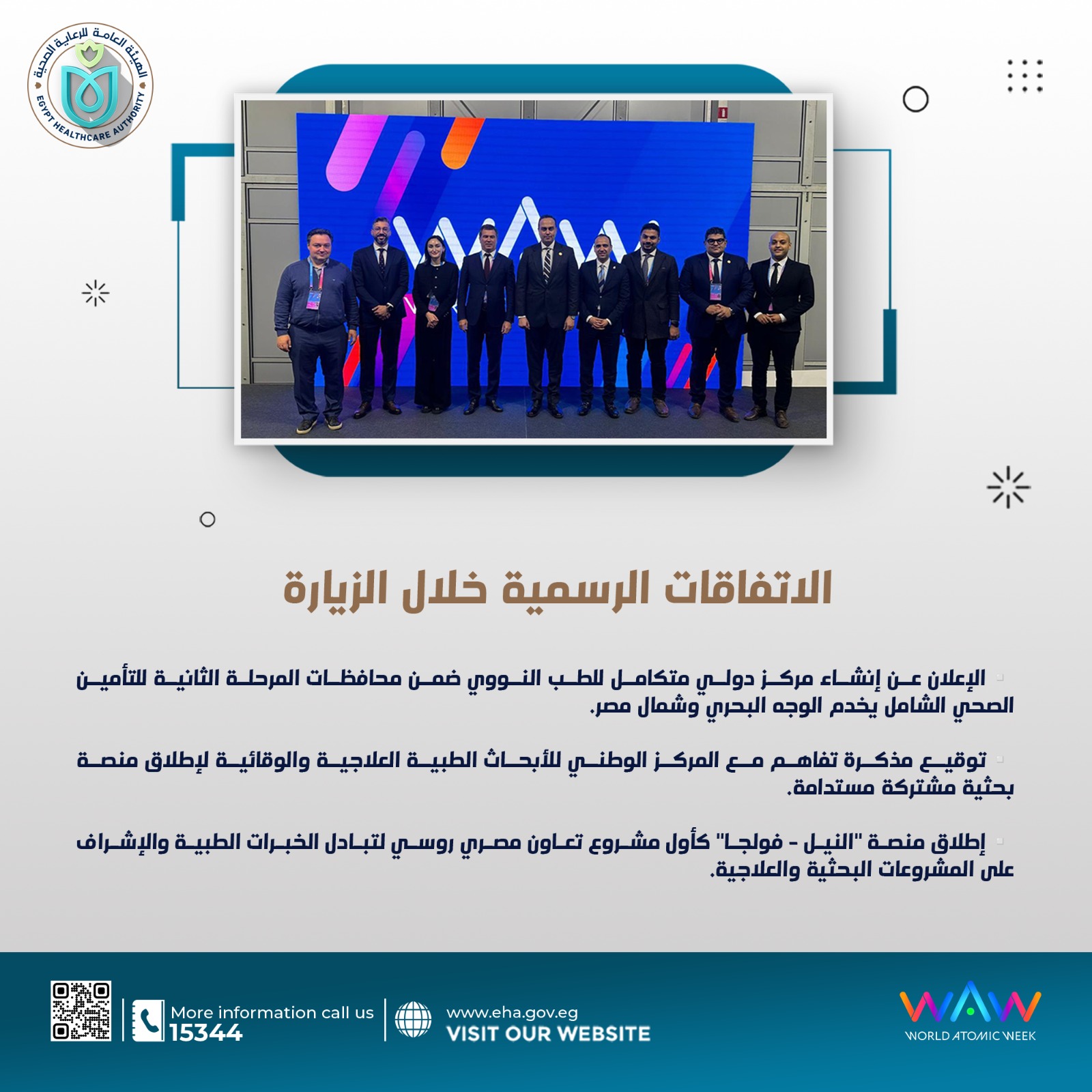 كما شهدت الزيارة الإعلان عن مجموعة من الاتفاقات المهمة، تضمنت إنشاء مركز دولي متكامل للطب النووي والعلاج الإشعاعي ضمن محافظات المرحلة الثانية للتأمين الصحي الشامل لخدمة محافظات الوجه البحري وشمال مصر، إلى جانب توقيع مذكرة تفاهم مع المركز الوطني للأبحاث الطبية العلاجية والوقائية لإطلاق منصة بحثية مشتركة مستدامة، فضلًا عن إطلاق منصة "النيل – فولجا" كأول مشروع تعاون مصري–روسي في مجال تبادل الخبرات الطبية والإشراف على المشروعات البحثية والعلاجية.