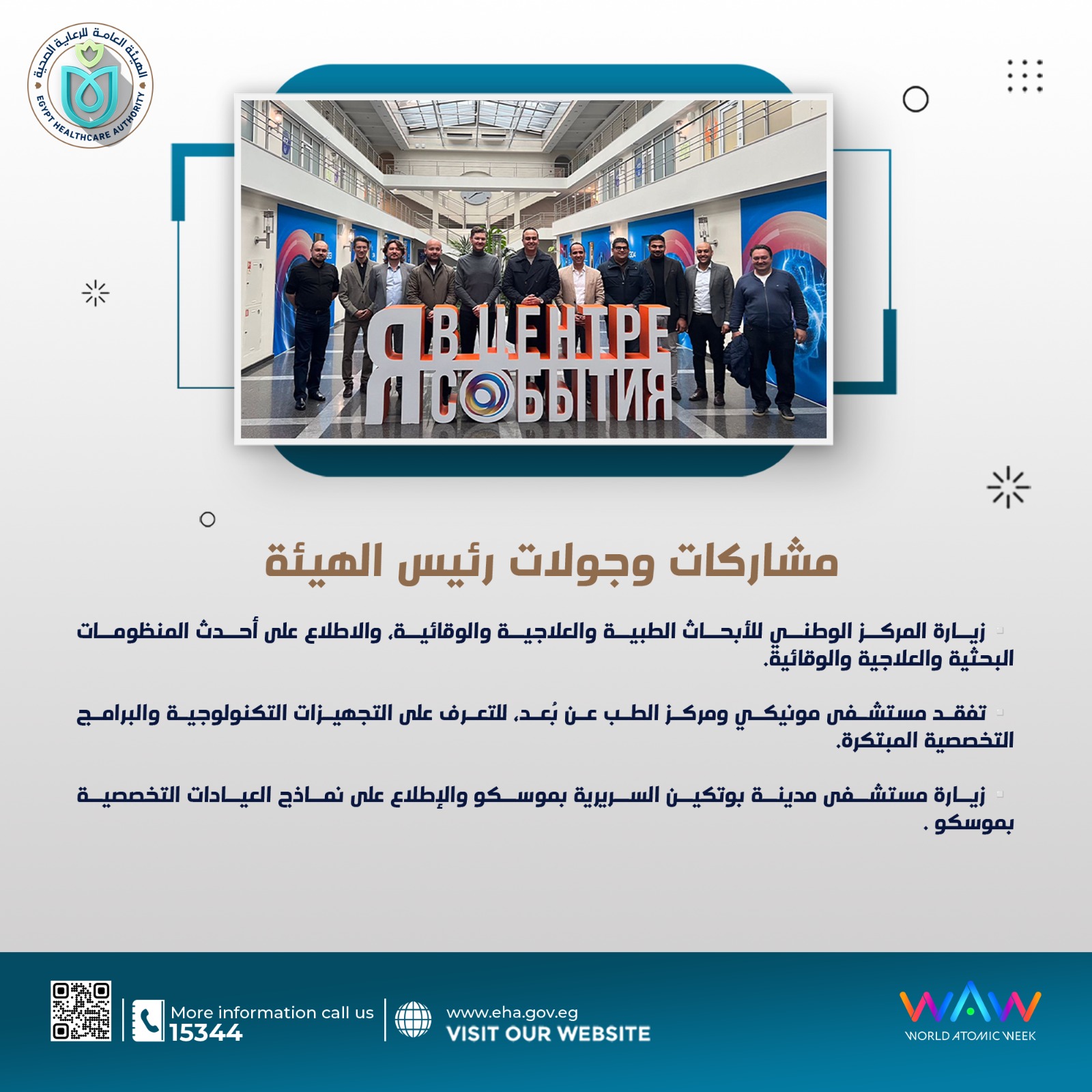 أصدرت الهيئة العامة للرعاية الصحية إنفوجرافًا يوضح أبرز محطات زيارة الدكتور أحمد السبكي، رئيس الهيئة العامة للرعاية الصحية والمشرف العام على مشروع التأمين الصحي الشامل، إلى العاصمة الروسية موسكو، وذلك خلال مشاركته في فعاليات الأسبوع الذري العالمي (WAW 2025)، والذي عُقد في الفترة من 25 حتى 28 سبتمبر الجاري.