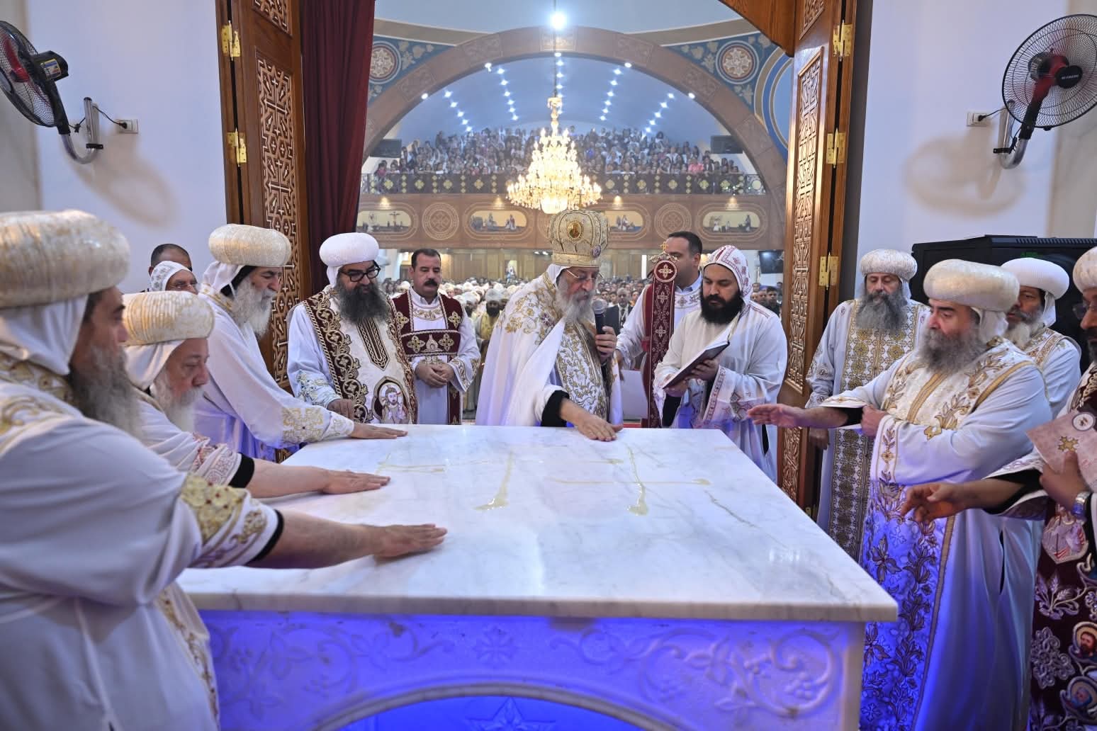وهنأ قداسة البابا نيافة الأنبا بيسنتي والكهنة والشعب بتدشين الكنيسة، مشيدًا بتعب مثلث الرحمات نيافة الأنبا لوكاس أسقف الإيبارشية السابق في بناء الكنيسة، وتعبه في رعاية الإيبارشية.