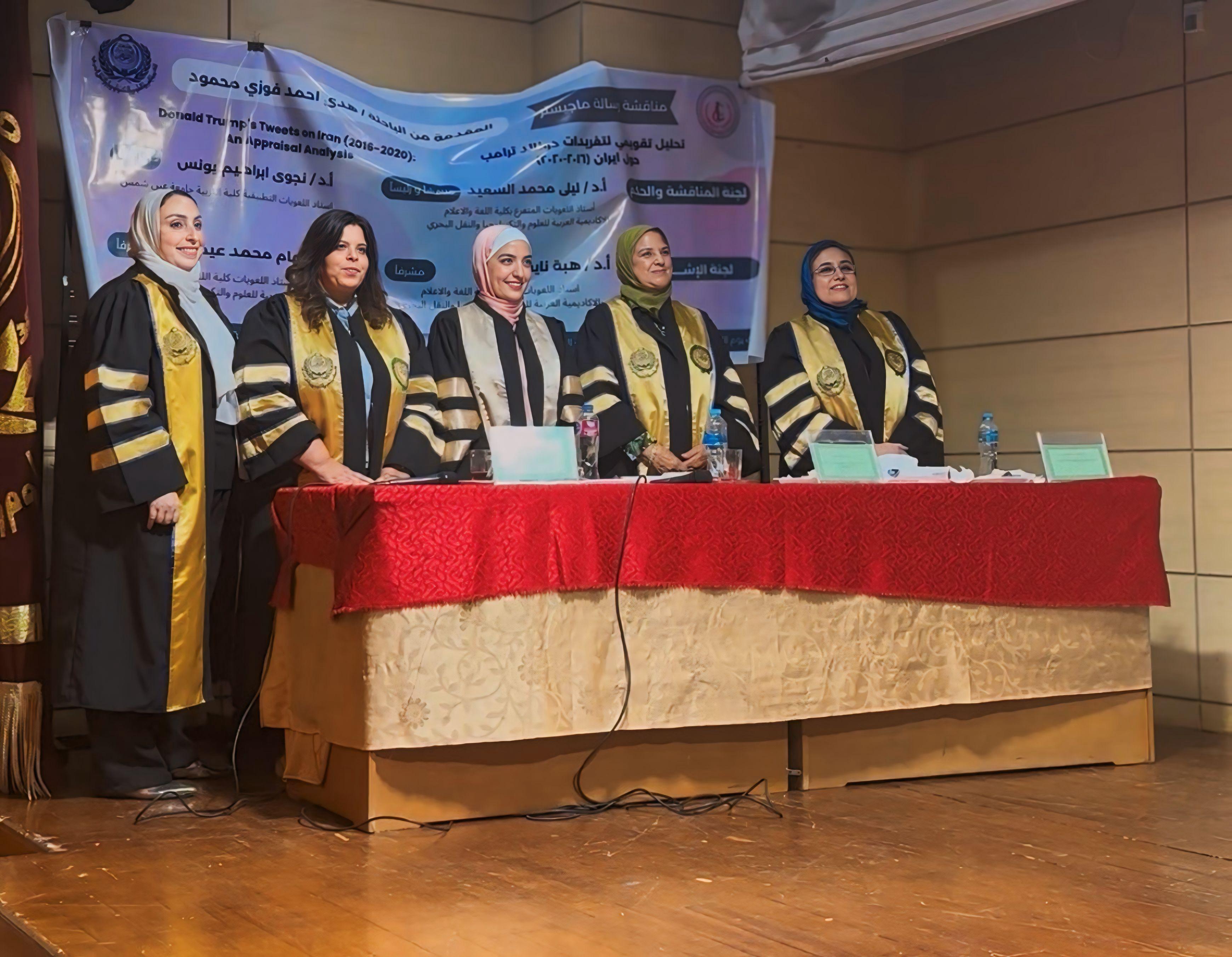 ناقشت الباحثة هدى أحمد فوزي محمود رسالة الماجستير بكلية اللغة والإعلام في الأكاديمية العربية للعلوم والتكنولوجيا والنقل البحري – فرع شيراتون، بعنوان "Donald Trump’s Tweets on Iran (2016–2020): An Appraisal Analysis".
