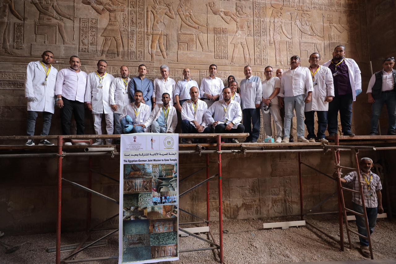 واستمع الوزير إلى شرح مفصل من فريق البعثة الأثرية المصرية الألمانية المشتركة، التي بدأت عملها منذ عام 2018، بهدف تنظيف السقف والجدران من طبقات السخام ومخلفات الطيور والأملاح التي تراكمت عبر قرون، وإظهار المناظر والنقوش الأصلية للمعبد. وتُعد النقوش الفلكية التي تزين سقف المعبد من أبرز ما يميز هذا الصرح الأثري الفريد، حيث تعكس جانباً مهماً من علوم المصريين القدماء.