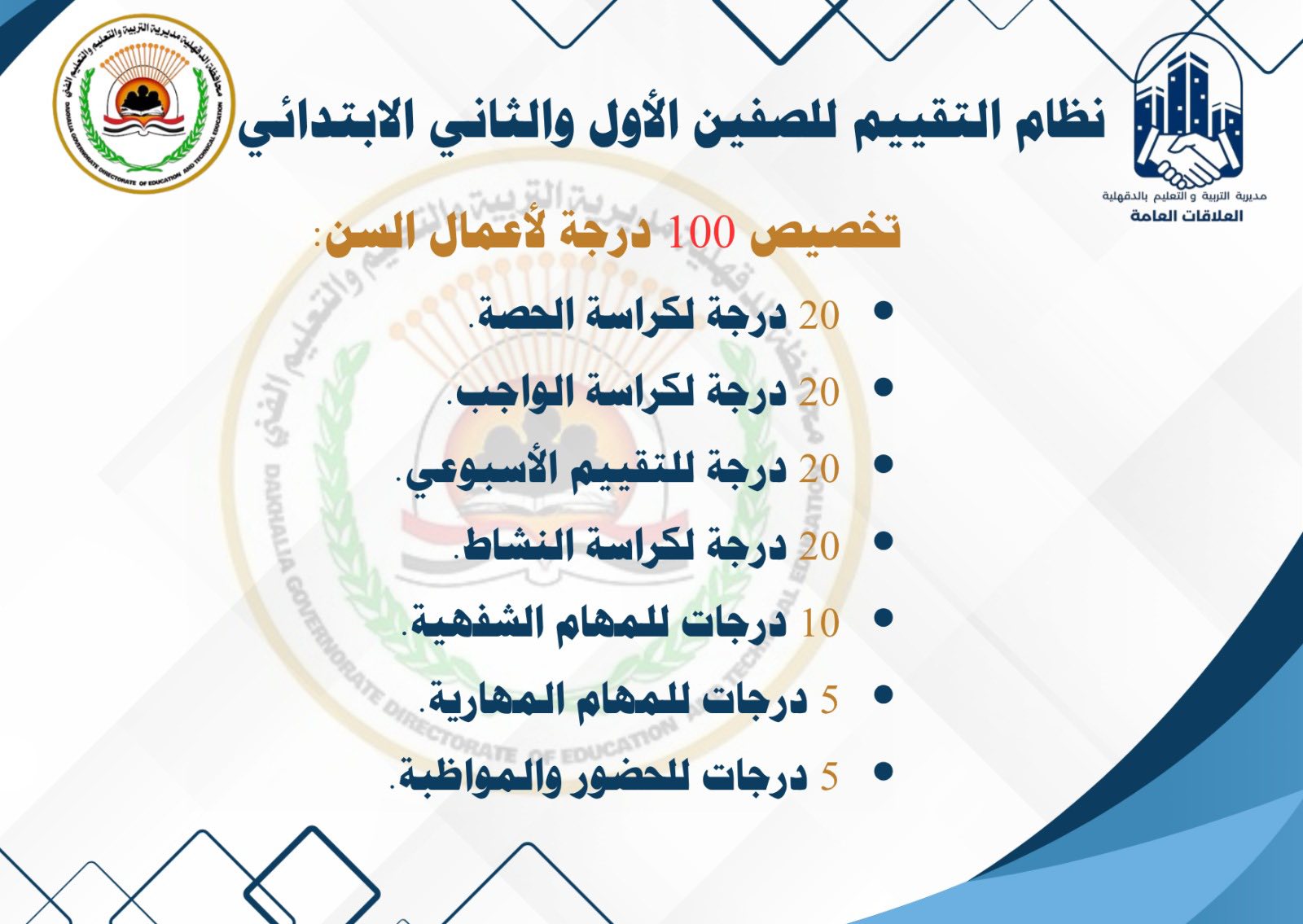 درجات أعمال السنة لطلاب الصفين الأول والثاني الابتدائي