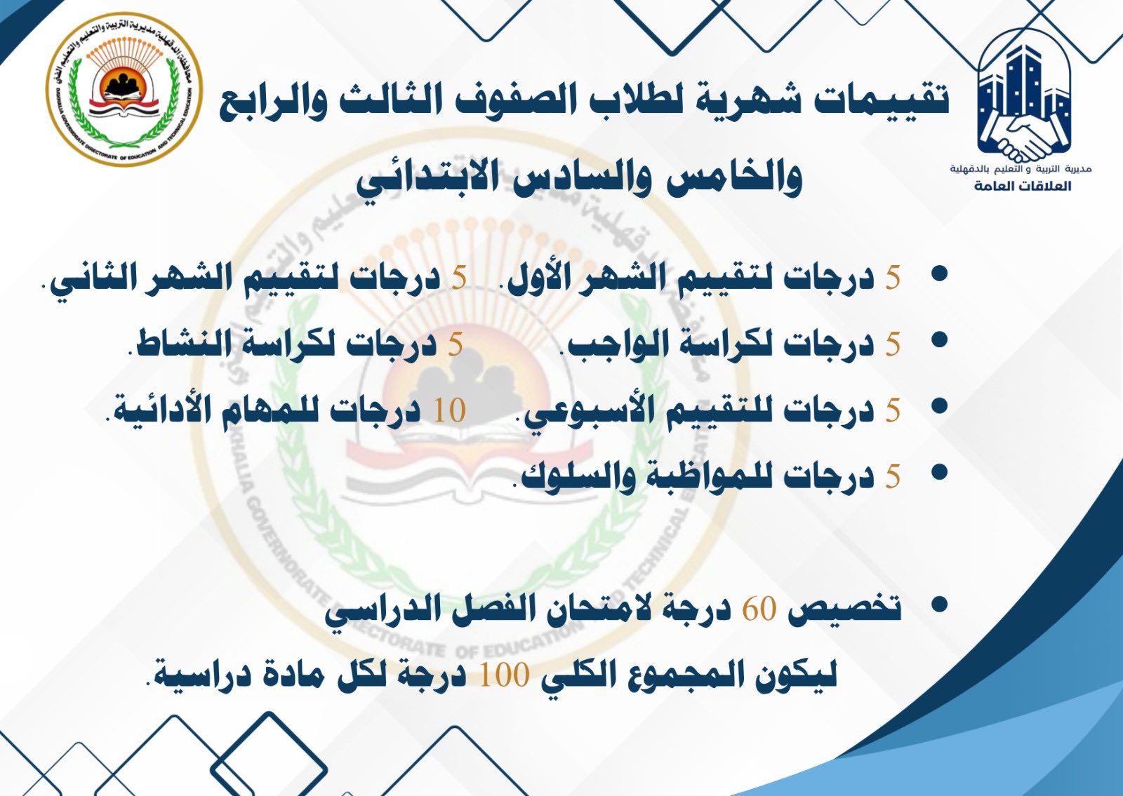 - تخصص 60 درجة لامتحان الفصل الدراسي ليكون المجموع الكلي 100 درجة لكل مادة دراسية
