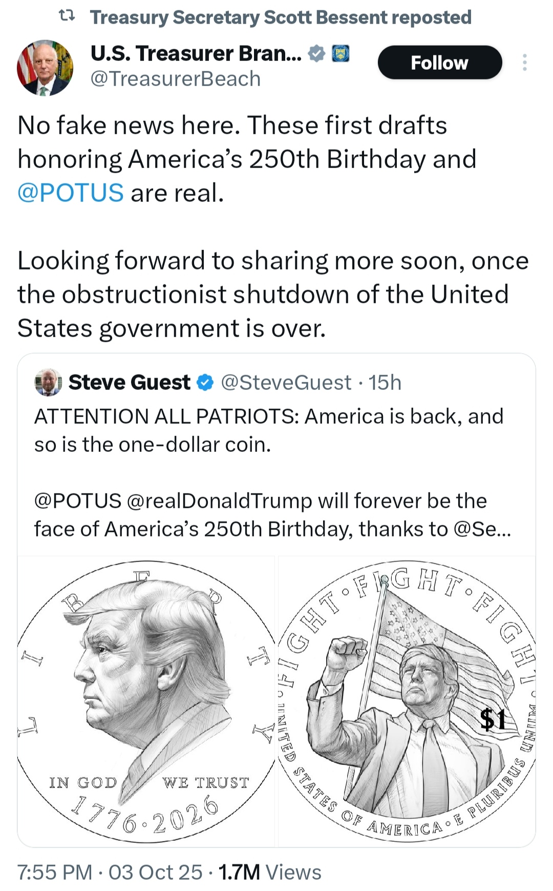 ووفقاً لما نقلته شبكة "فوكس بيزنس"، فإن وزارة الخزانة تدرس عدة تصاميم مقترحة للعملة الجديدة، من بينها تصميم مبدئي يُظهر ترامب أمام العلم الأمريكي رافعاً قبضته في مشهد رمزي يعكس ما يصفه أنصاره بـ"قوة الإرادة الوطنية".