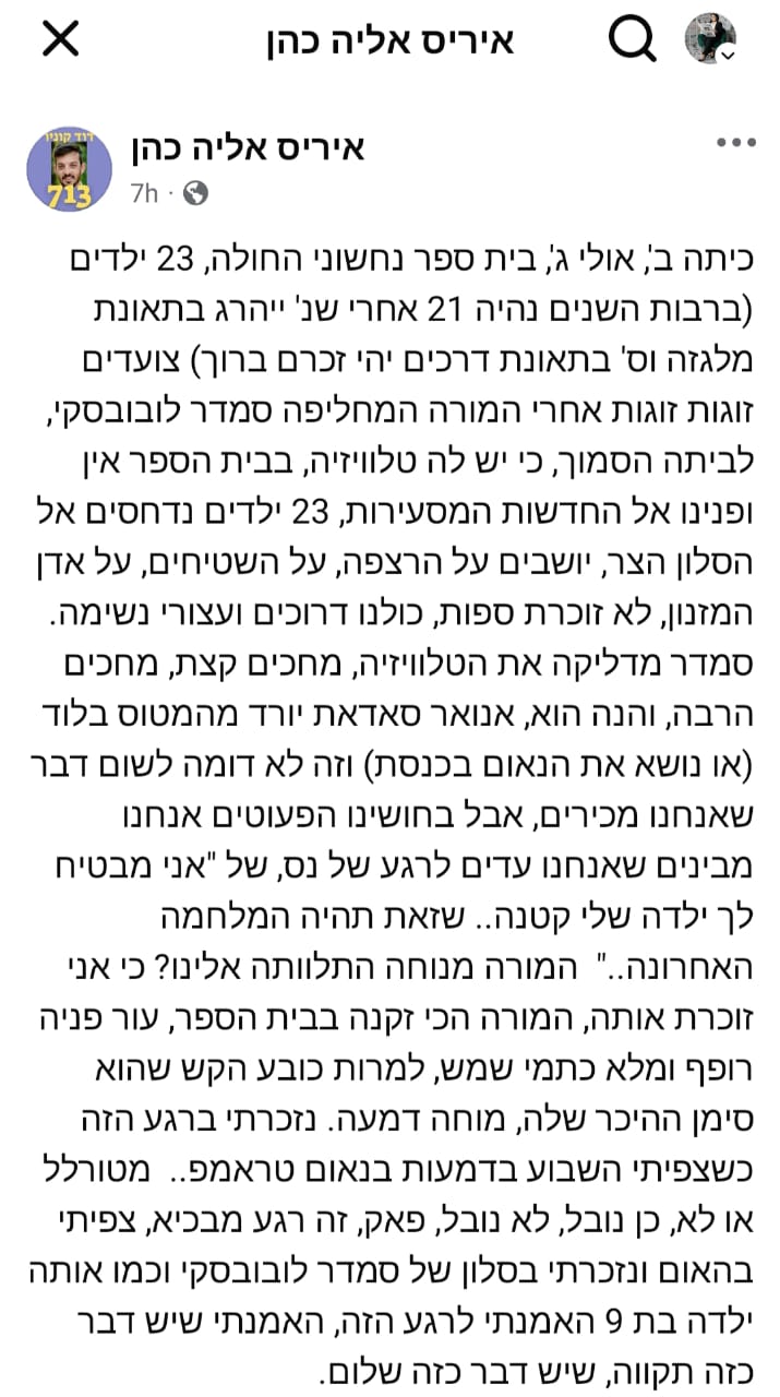 أشارت الكاتبة إلى ذكرياتها الطفولية المؤثرة، حين كانت في الصف الثاني أو الثالث بمدرسة "نحشوني هحولا"، برفقة 23 طفلًا زملاءها، يسيرون خلف معلمتهم البديلة سمادر لوفوفسكي إلى بيتها القريب لمشاهدة التلفزيون، لعدم وجود جهاز في المدرسة.