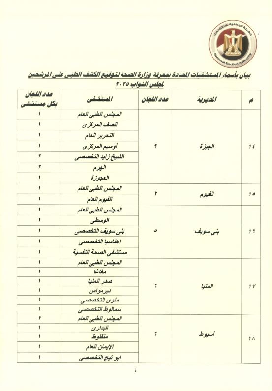 ينشر موقع صدى البلد بيان بأسماء المستشفيات المحددة بمعرفة وزارة الصحة لتوقيع الكشف الطبي على المرشحين لانتخابات مجلس النواب 2025.
