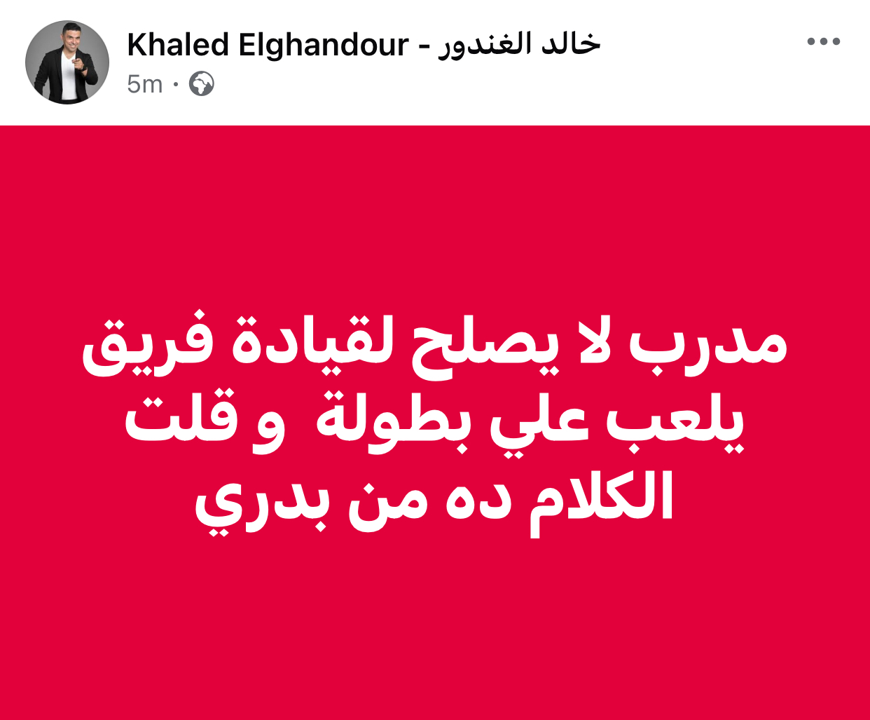 وكتب الغندور عبر حسابه الشخصي على موقع “فيسبوك”: “مدرب لا يصلح لقيادة فريق يلعب على بطولة، وقلت الكلام ده من بدري”.