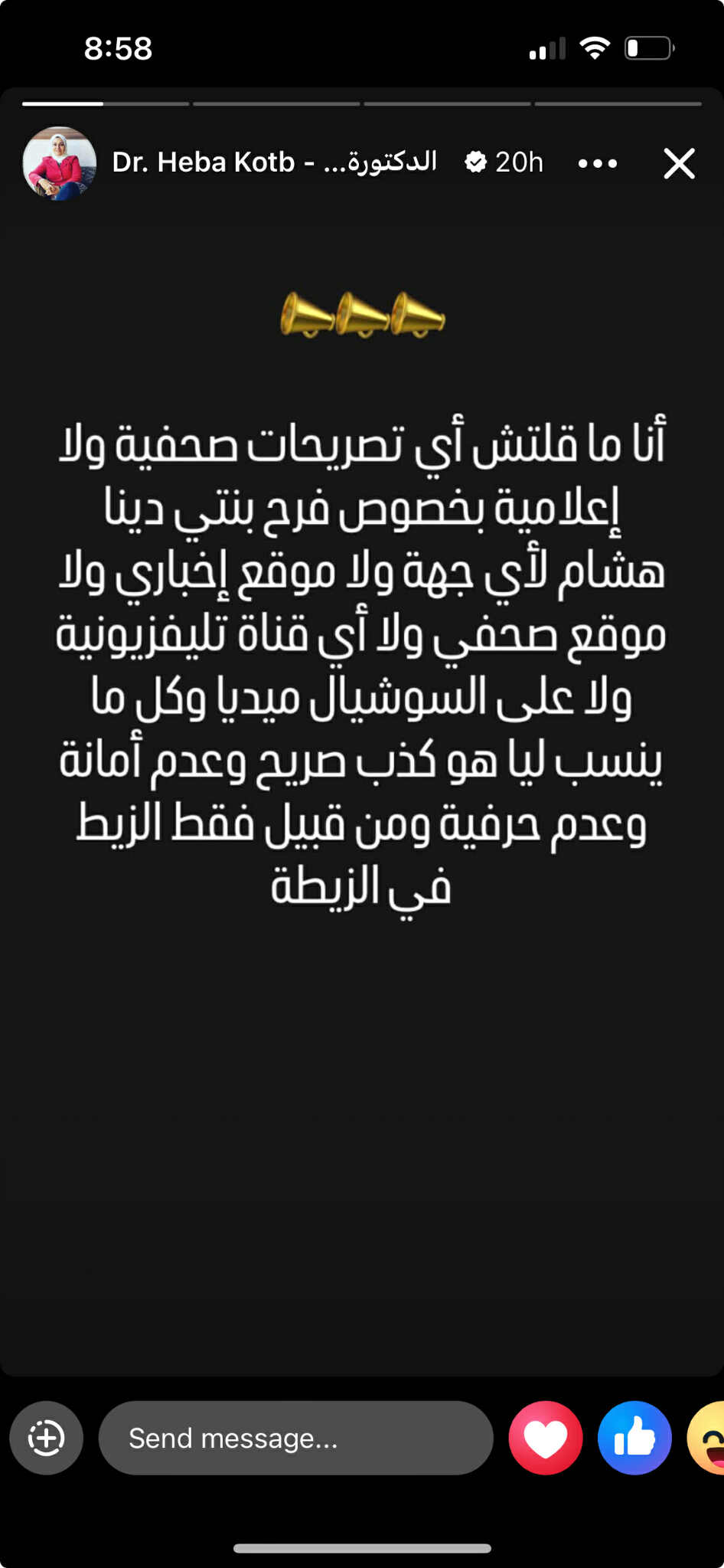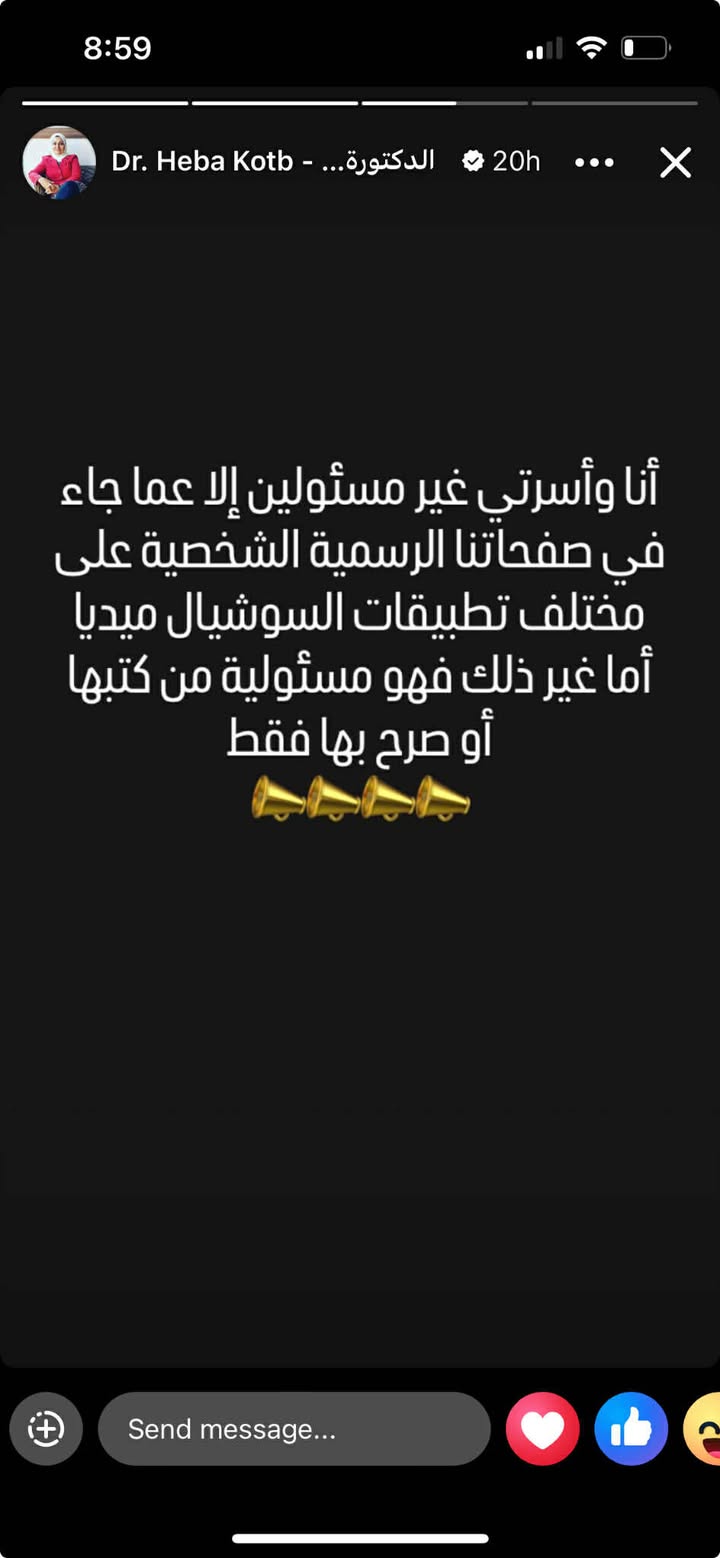 وأكدت أنها تحتفظ بحقها في اتخاذ الإجراءات القانونية ضد أي جهة أو شخص يروّج لتصريحات أو أخبار كاذبة تمسها أو أسرتها، مشددة على ضرورة تحري الدقة والمصداقية في تداول الأخبار.