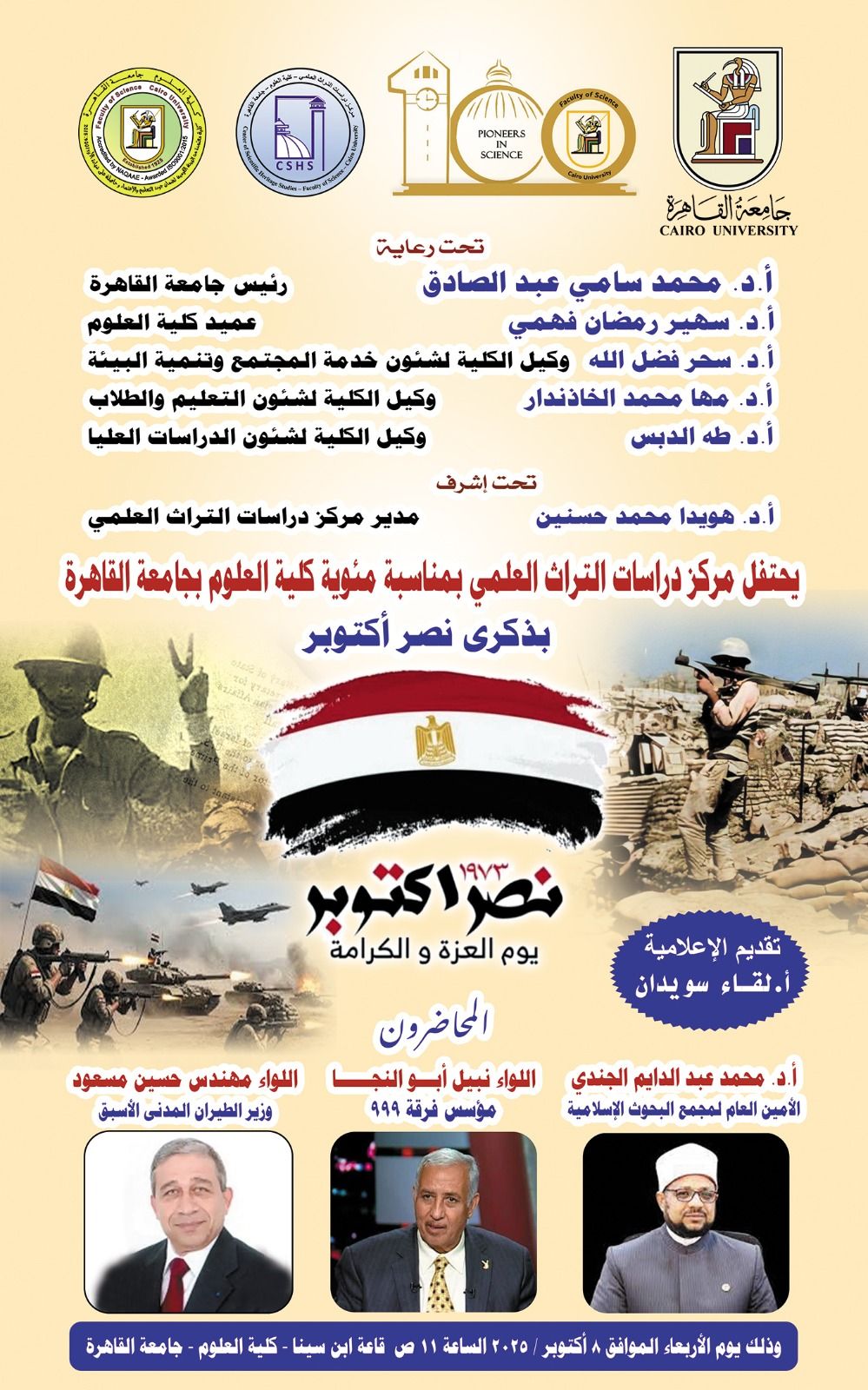 وذلك يوم الأربعاء الموافق 8 أكتوبر 2025 الساعة 11 صباحا، بقاعة ابن سينا - كلية العلوم - جامعة القاهرة.