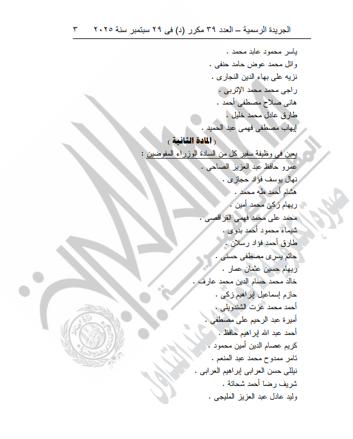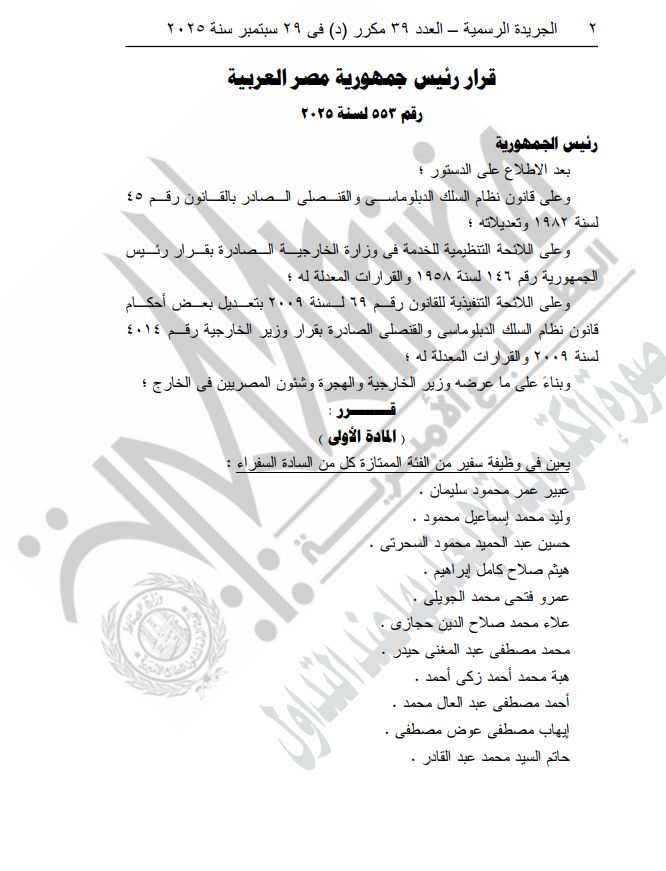 ونص القرار أن رئيس الجمهورية بعد الاطلاع على الدستور؛ وعلى قانون نظام السلك الدبلوماسي والقنـصلي الـصادر بالقـانون رقـم 45 لسنة 1982 وتعديلاته؛ وعلى اللائحة التنظيمية للخدمة في وزارة الخارجيـة الـصادرة بقـرار رئـيس الجمهورية رقم 146 لسنة 1958 والقرارات المعدلة له؛ وعلى اللائحة التنفيذية للقانون رقـم 69 لـسنة 2009 بتعـديل بعـض أحكـام قانون نظام السلك الدبلوماسى والقنصل الصادرة بقرار وزير الخارجية رقـم 4014 لسنة 2009 والقرارات المعدلة له؛ وبناء على ما عرضه وزير الخارجية والهجرة وشئون المصريين فى الخارج