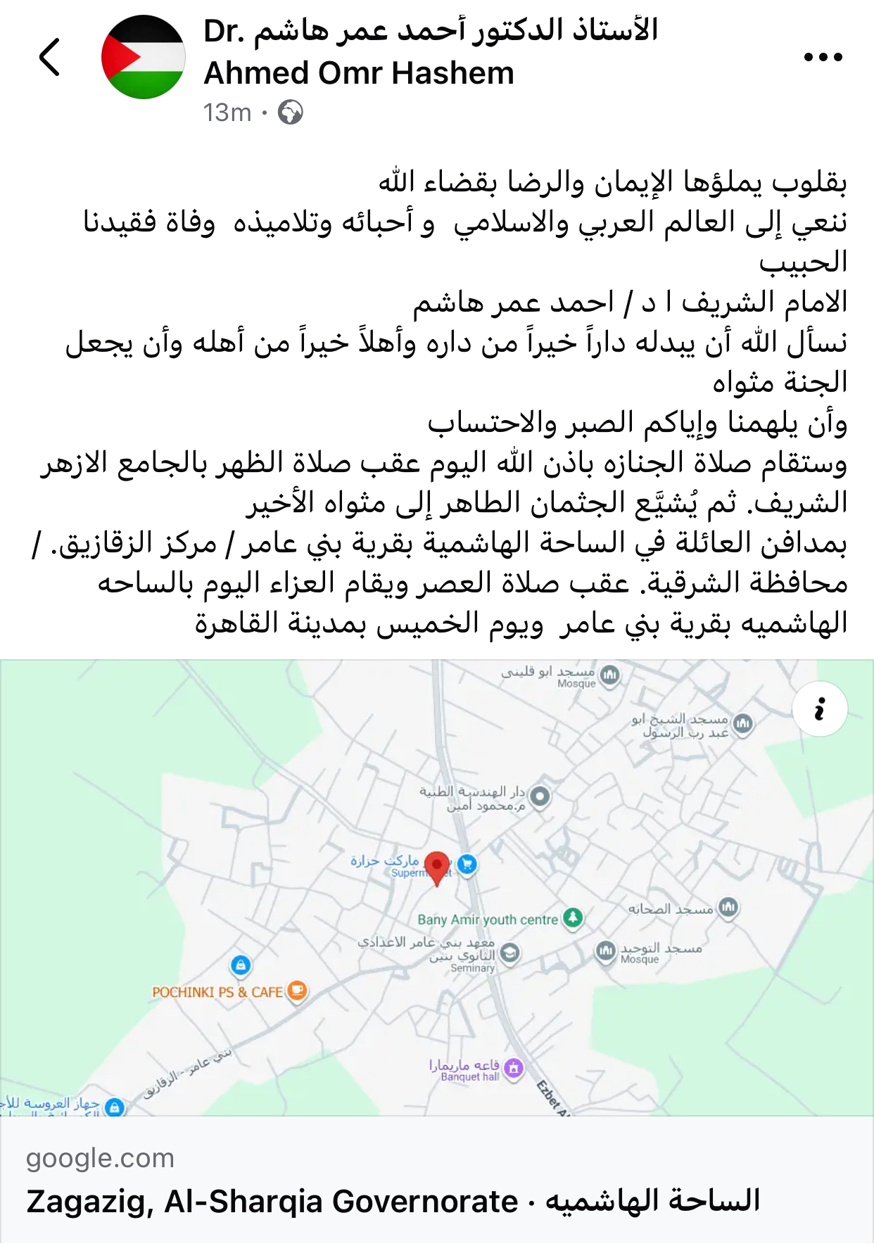 أعلنت الصفحة الرسمية للإمام الشريف الأستاذ الدكتور أحمد عمر هاشم، أحد أبرز علماء الأزهر الشريف ورئيس جامعة الأزهر الأسبق، الذي رحل عن عالمنا اليوم بعد صراع مع المرض.