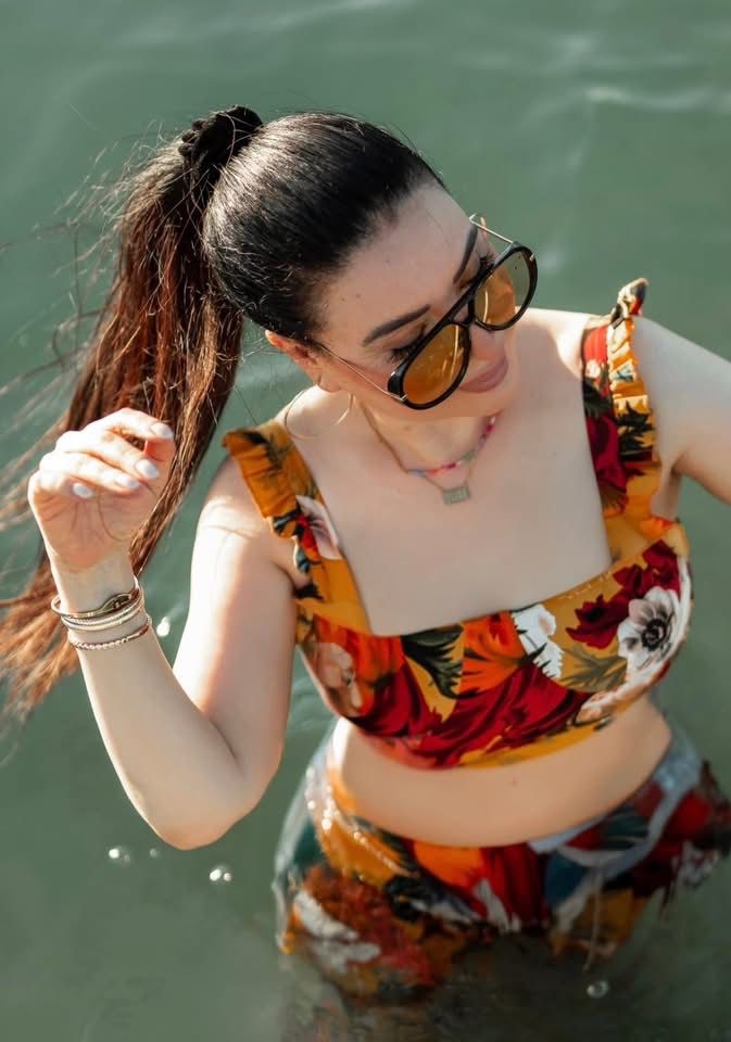 وارتدت عبير في الصور طقمًا أنيقًا مزينًا بنقوش الزهور ذات الألوان الزاهية، بينما ظهرت بابتسامة عفوية تعكس حالة من البهجة والاسترخاء في أجواء الصيف.