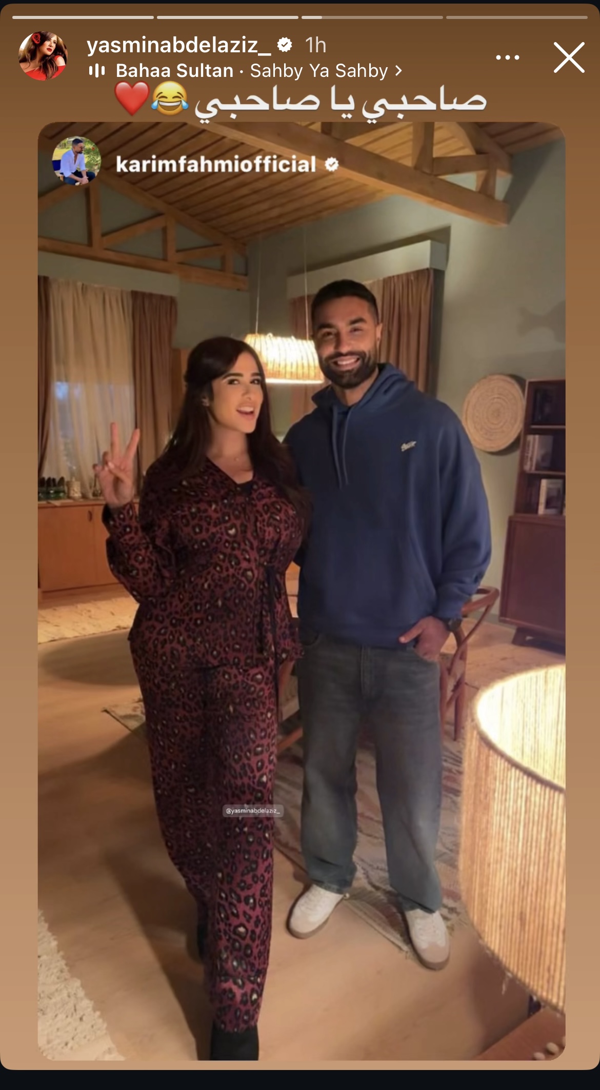 وظهرت ياسمين عبد العزيز رفقة الفنان كريم فهمي، وعلقت على ظهورهم معا: “صاحبي يا صاحبي ”.