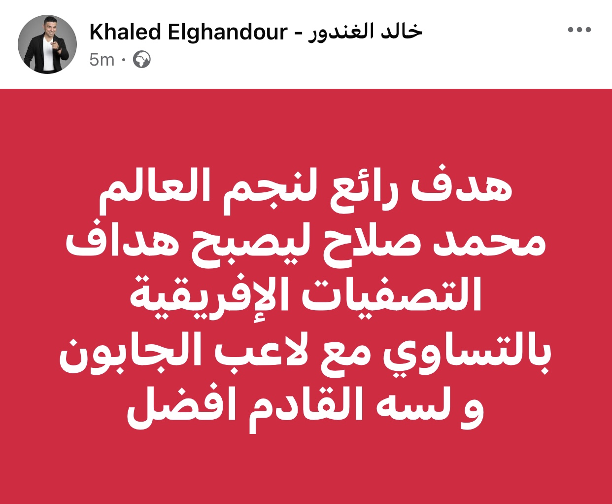 وكتب “الغندور” على حسابه الرسمي بموقع فيسبوك: "هدف رائع لنجم العالم محمد صلاح ليصبح هداف التصفيات الإفريقية بالتساوي مع لاعب الجابون ولسة القادم أفضل".
